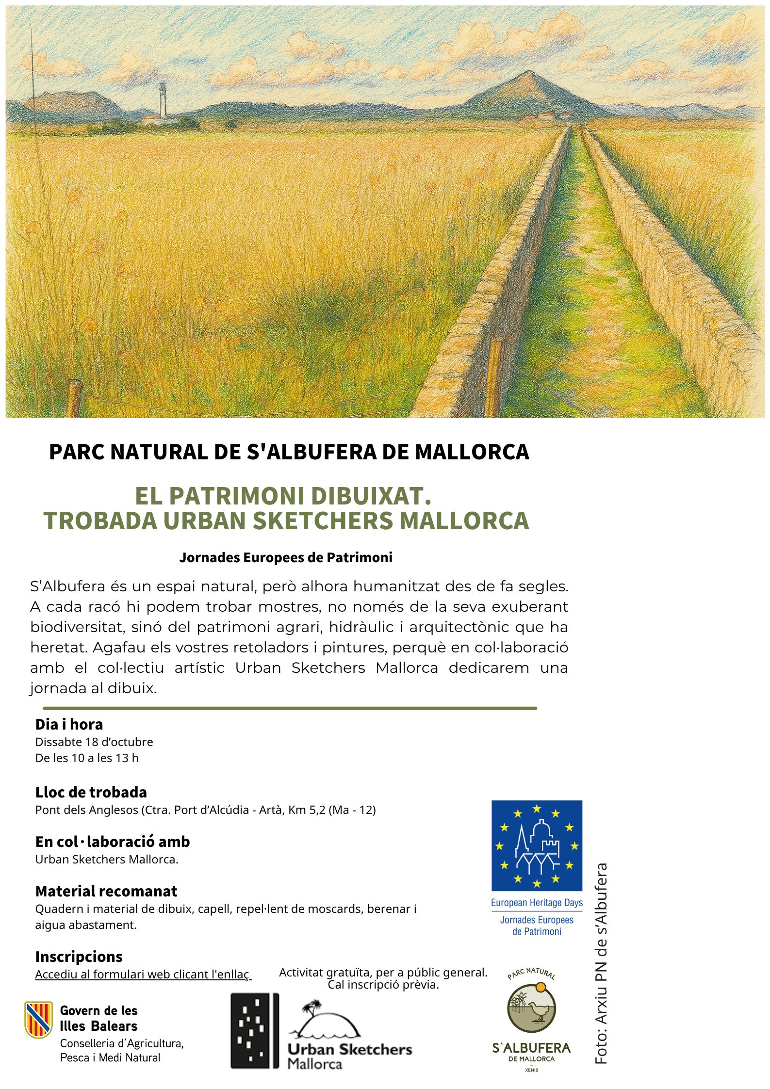 S’Albufera és un espai natural, però alhora humanitzat des de fa segles. A cada racó hi podem trobar mostres, no només de la seva exuberant biodiversitat, sinó del patrimoni agrari, hidràulic i arquitectònic que ha heretat. Agafau els vostres retoladors i pintures, perquè en col·laboració amb el col·lectiu artístic Urban Sketchers Mallorca dedicarem una jornada al dibuix.