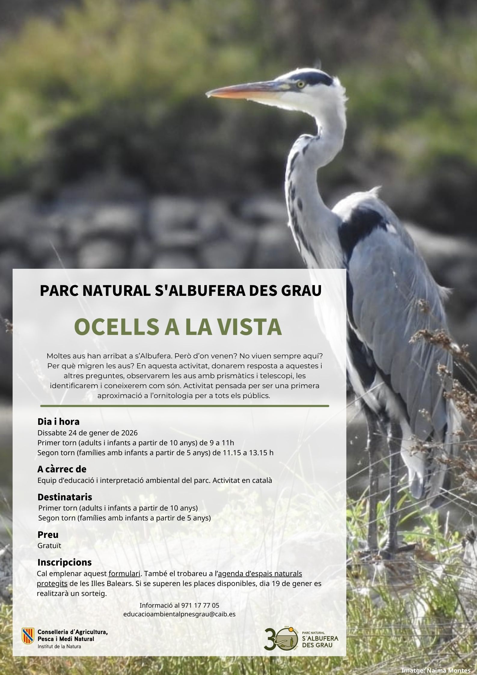 DESCRIPCIÓ: Moltes aus han arribat a s’Albufera. Però d’on venen? No viuen sempre aquí? Per què migren les aus? En aquesta activitat, donarem resposta a aquestes i altres preguntes, observarem les aus amb prismàtics i telescopi, les identificarem i coneixerem com són. Activitat pensada per ser una primera aproximació a l’ornitologia per a tots els públics.