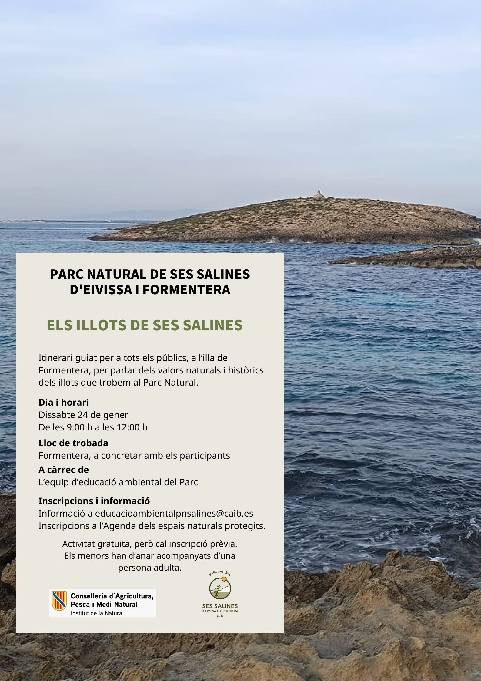 DESCRIPCIÓ: Itinerari guiat per conèixer els valors naturals i històrics dels illots que es troben dins el Parc Natural, des de l'lla de Formentera.