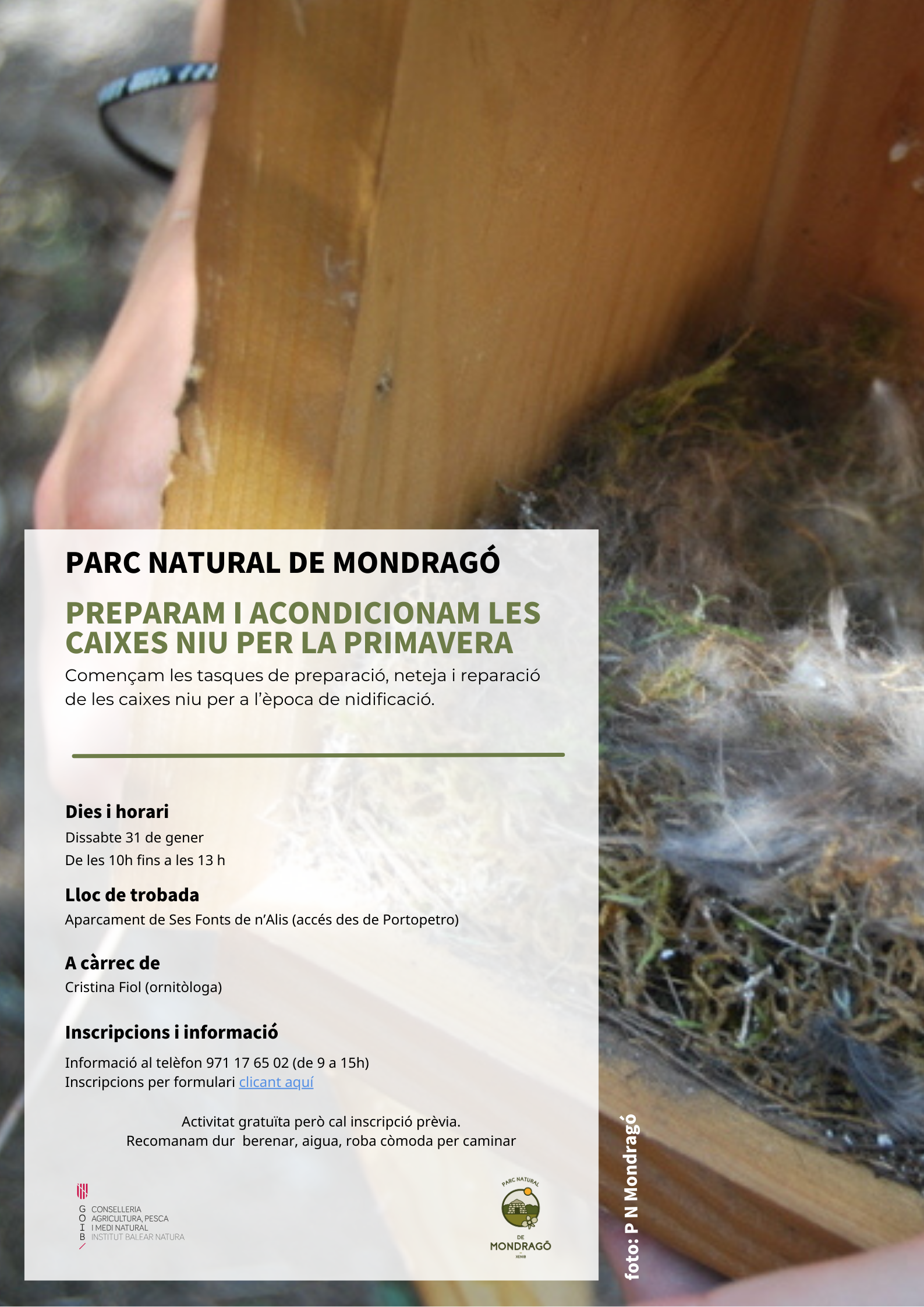 DESCRIPCIÓ: Farem un recorregut per revisar les caixes niu, acondicionar-les i, si és necessari, fer petites reparacions, tot per preparar l'època de nidificació.