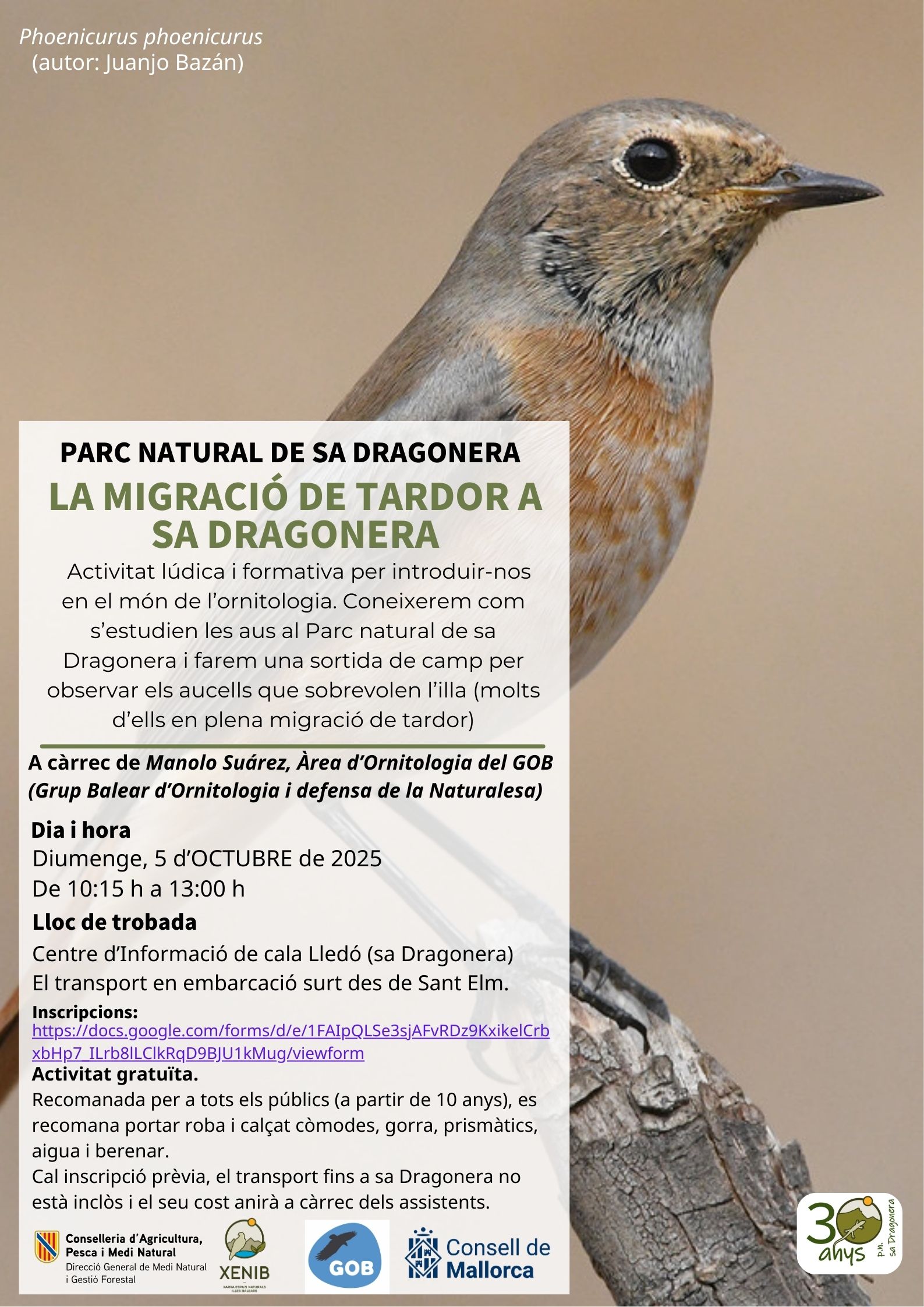 DESCRIPCIÓN: Actividad lúdica y formativa para introducirnos en el mundo de la ornitología. Conoceremos como se estudian las aves en el Parque natural de sa Dragonera y haremos una salida de campo para observar las aves que sobrevuelan la isla (muchas de ellas en plena migración otoñal)