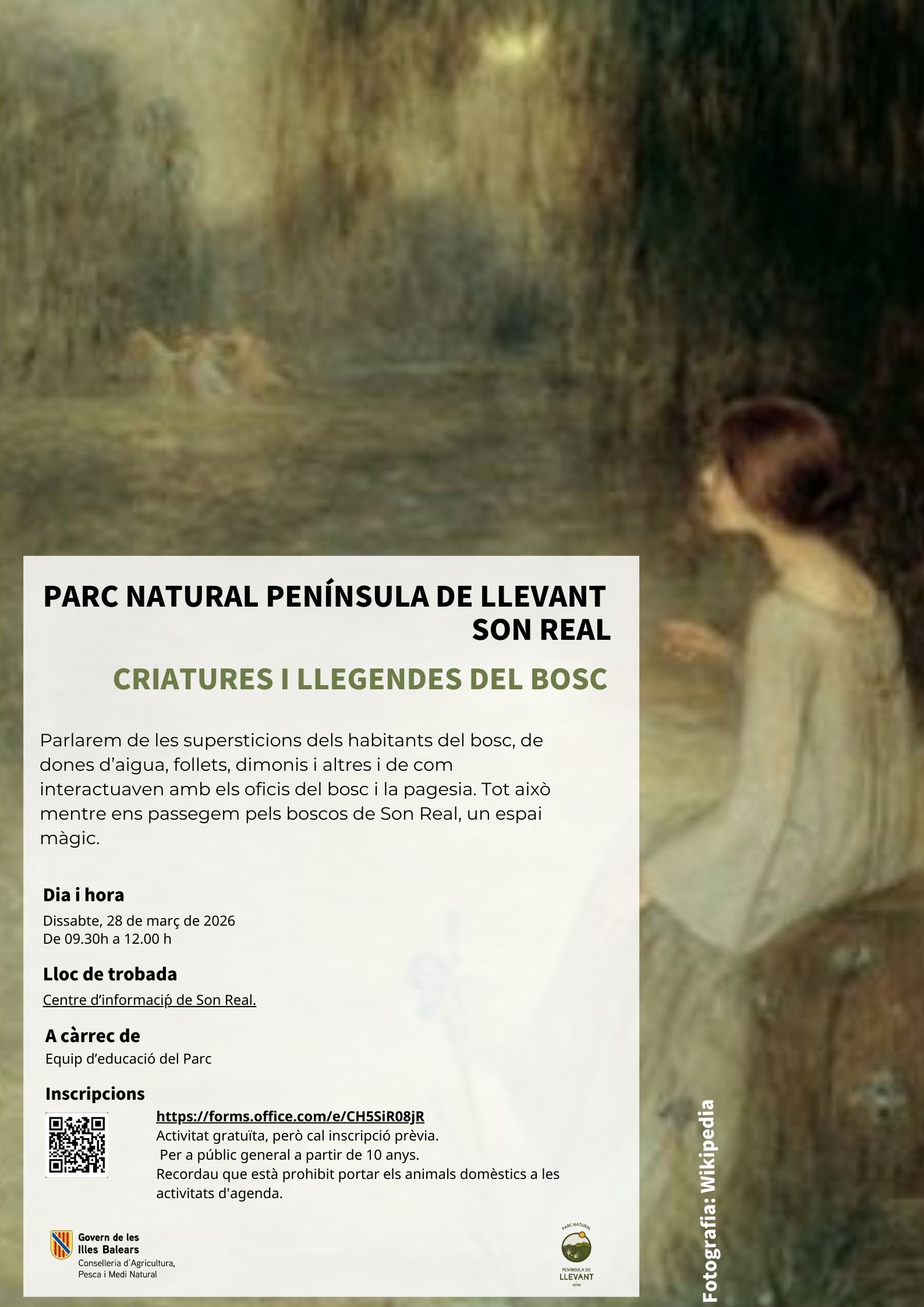 DESCRIPCIÓN: Pasearemos por los bosques de Son Real, un espacio mágico donde nos introduciremos en las supersticiones de los habitantes del bosque, hadas de agua, duendes, diablillos y similares y cómo éstos interactuaban con los oficios y la gente del campo.