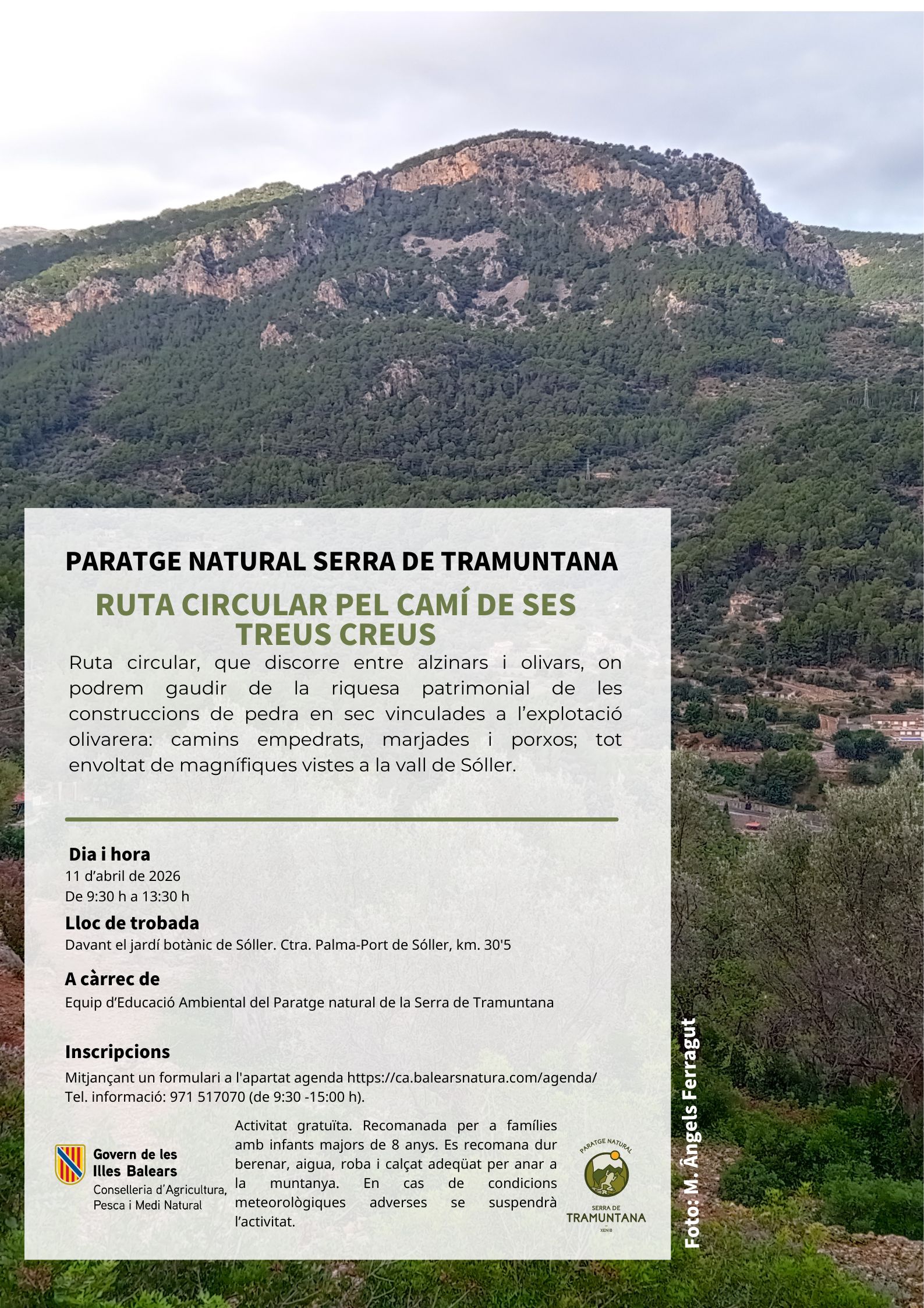 A CARGO DEL: Equipo de Educación Ambiental del Paraje Natural de la Serra de Tramuntana.DESCRIPCIÓN: Ruta circular, que discurre entre encinares y olivares, donde podremos disfrutar de la riqueza patrimonial de las construcciones de piedra en seco vinculadas a la explotación olivarera: caminos empedrados, bancales y porches; todo rodeado de magníficas vistas al valle de Sóller .