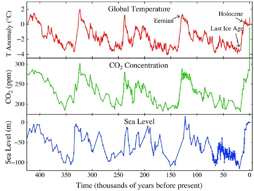 Figura 2. Evolució de la temperatura, la concentració de CO2 i el nivell de la mar. Font: Johnenglander