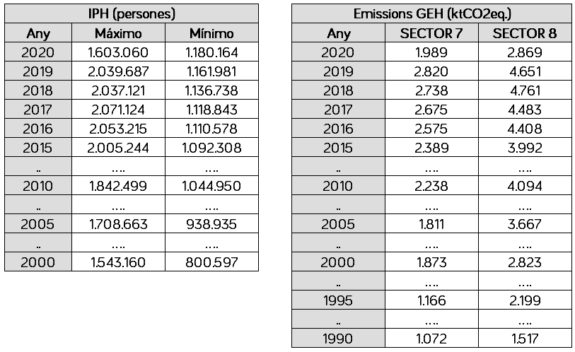 Figura 6. Taula amb dades de l’indicador de pressió humana (esquerra) i emissions totals de GEH (dreta). Font: elaboració pròpia.
