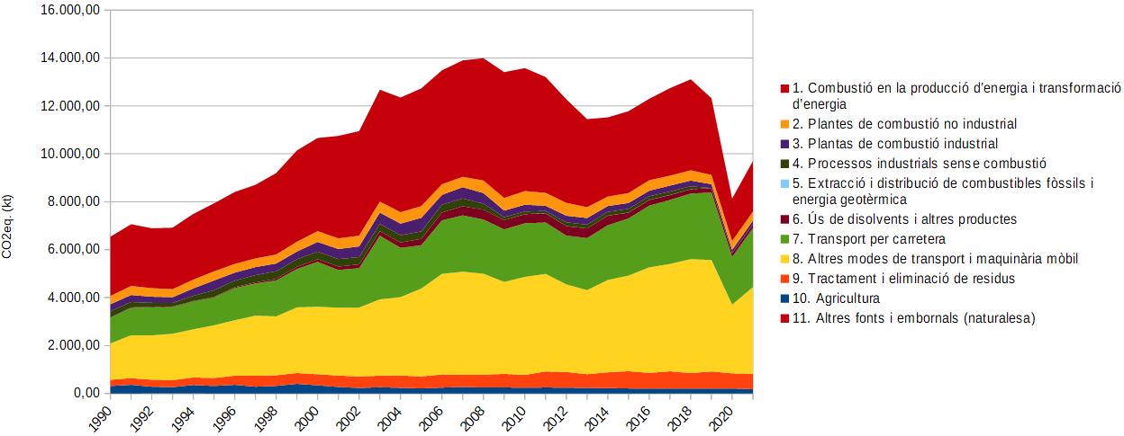 La resta de sectors són: plantes de combustió no industrial (inclou el sector residencial, els comerços i serveis, i l’administració pública), plantes de combustió industrial, processos industrials, extracció i distribució de combustibles, ús de dissolvents i altres productes, tractament i eliminació de residus, agricultura i altres fonts.