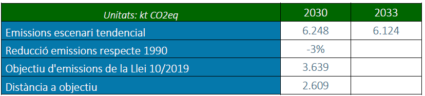 L’escenari d’emissions tendencial serà el punt de partida per definir les accions addicionals que haurà d’establir el Pla de Transició Energètica i Canvi Climàtic per aconseguir arribar a l’escenari objectiu de reducció d’emissions establert a la Llei 10/2019.