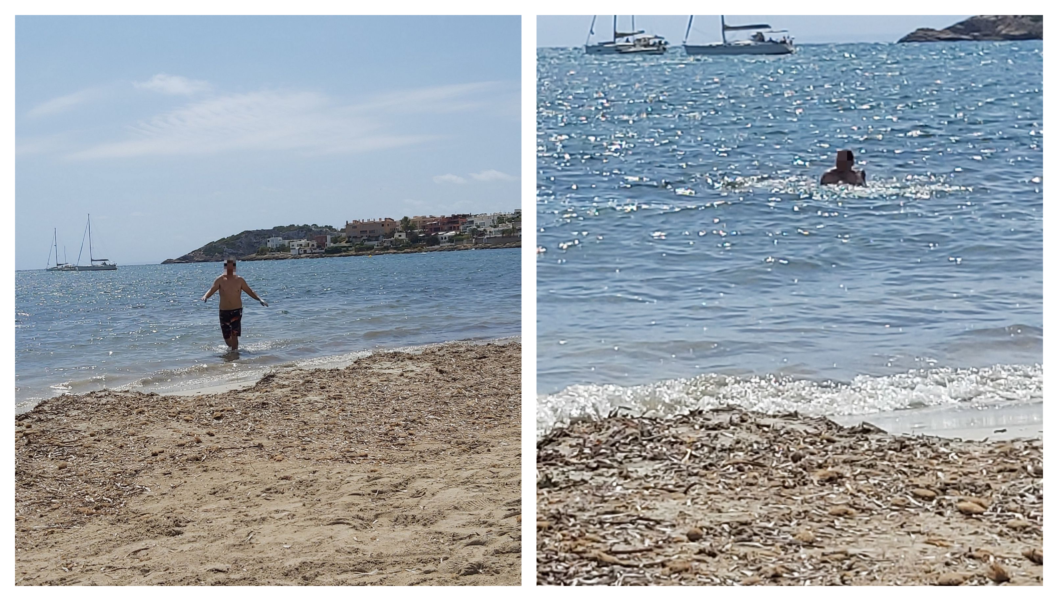 Sortim caminant cap a la platja, sortim més tard del que és habitual i, com que arribam amb molta calor, posam les tovalloles a l’arena i tot d’una ens ficam a l’aigua.