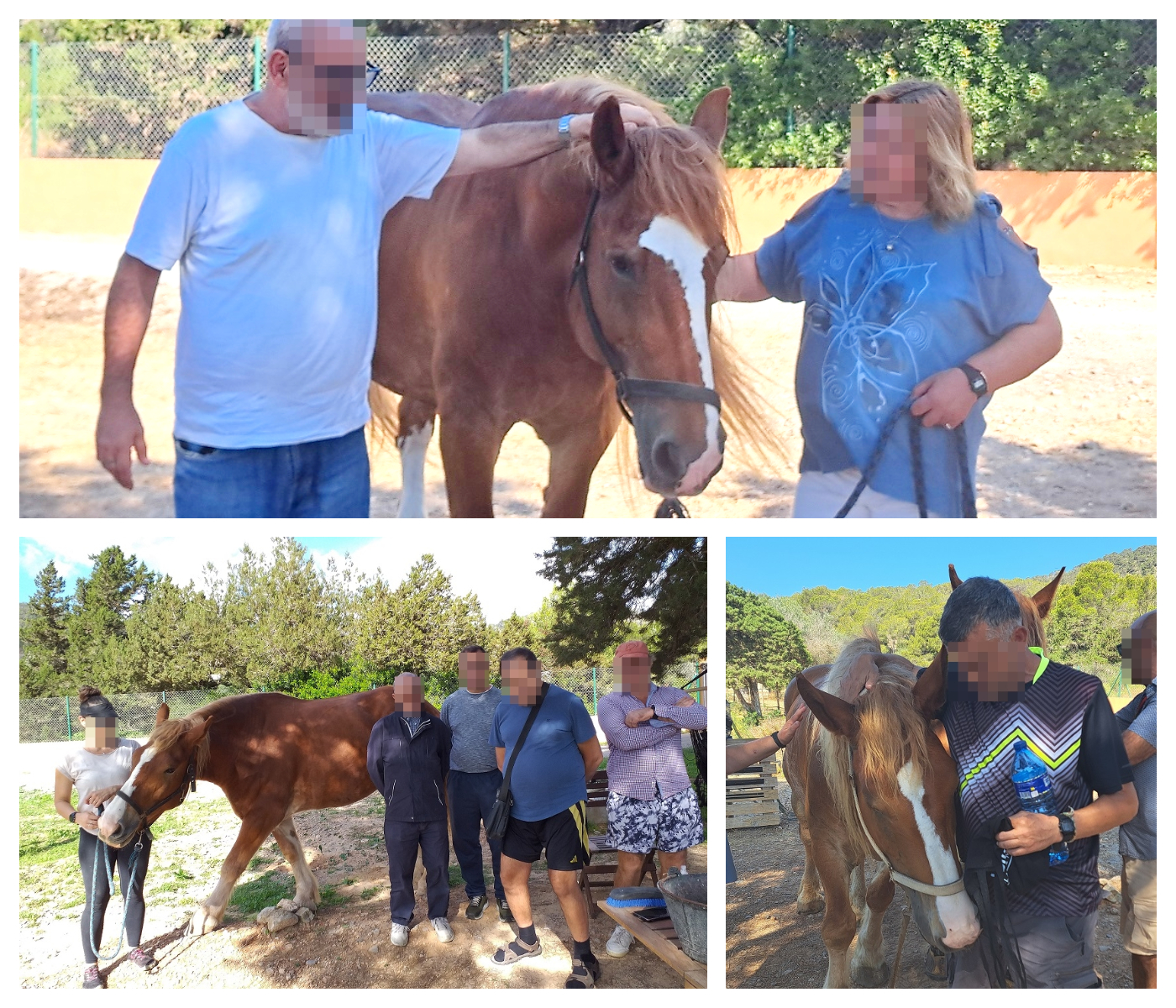 En arribar a la granja la terapeuta ens mostra els cavalls i les sis persones usuàries participants en l’activitat comencen a passejar-los per un circuit creat per a elles.