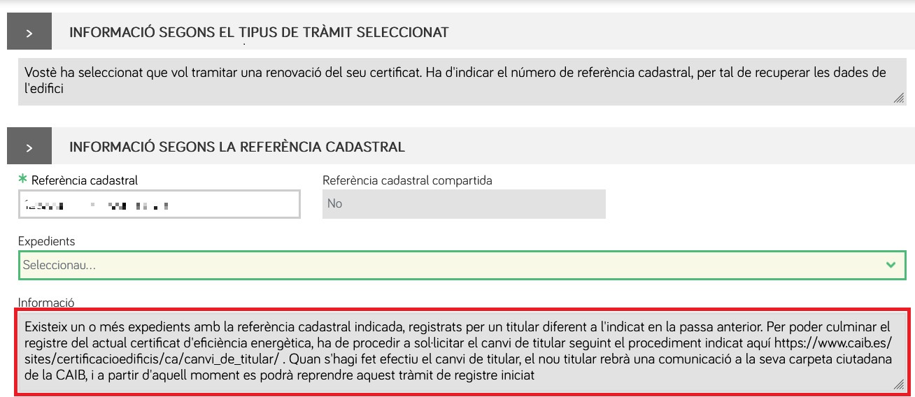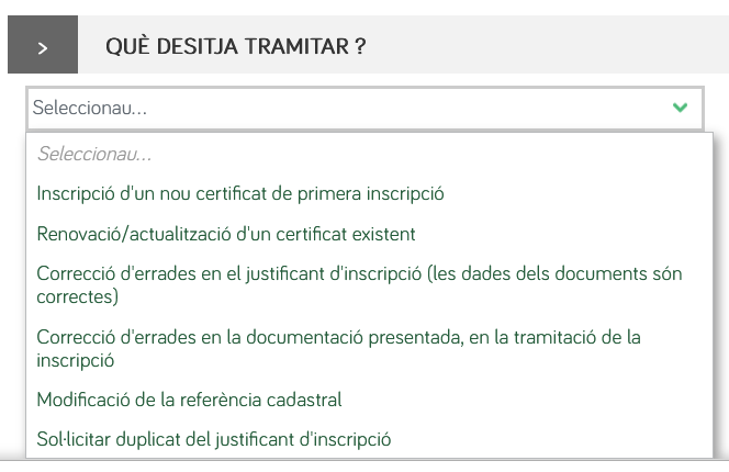 És important conèixer si per a una referència cadastral concreta, hi ha o no registrat algun/s certificat, doncs en cas d'haver-hi algun, en el camp desplegable de la primera pantalla del tràmit, que pregunta ¿Què voleu tramitar?, s'haurà de triar, si hi ha/n algun/s certificat registrats amb aquesta referència cadastral, l'opció Renovació/actualització d'un certificat existent, i si no hi ha cap, l'opció Inscripció d'un nou certificat de primera inscripció.