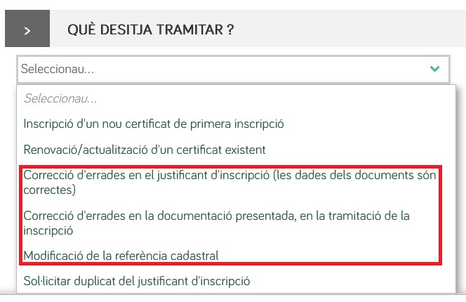 - Correcció d'errades en el justificant d'inscripció (les dades dels documents són correctes): Triant aquesta opció, es poden corregir les dades introduïdes al formulari de registre, que són les dades que la plataforma fa servir per generar el justificant d'inscripció i l'etiqueta energètica.