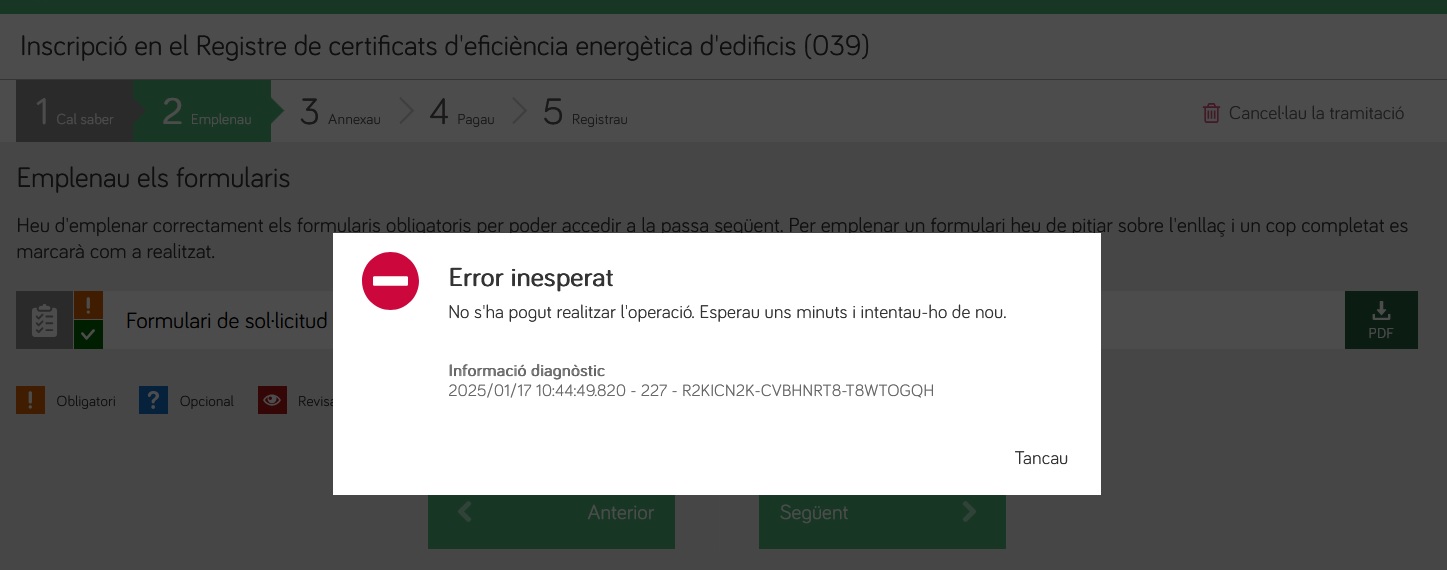 NOTA: Es recorda que aquesta opció, és la darrera i només es pot fer servir de manera extraordinària, tenint en qualsevol cas en compte, que el termini per obtenir el registre i emissió de l'etiqueta energètica pot arribar a ser de varies setmanes. En cas de problemes de funcionament del tràmit telemàtic específic de registre de certificats d'eficiència energètica, normalment és més ràpid provar en horari de tarda a fer el registre o fins i tot un altre dia, abans de fer servir l'opció de registrar-lo mitjançant el tràmit d'instància genèrica.