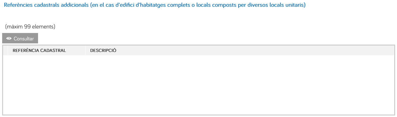 - En l'apartat referències cadastrals addicionals (en el cas d'edifici d'habitatges complets o locals composts per diversos locals unitaris), s'han d'afegir les diferents referències cadastrals que integren l'edifici objecte del certificat d'eficiència energètica que s'està registrant, cada una amb els seus 20 dígits indicant en el camp Descripció, a quin habitatge o local es correspon.