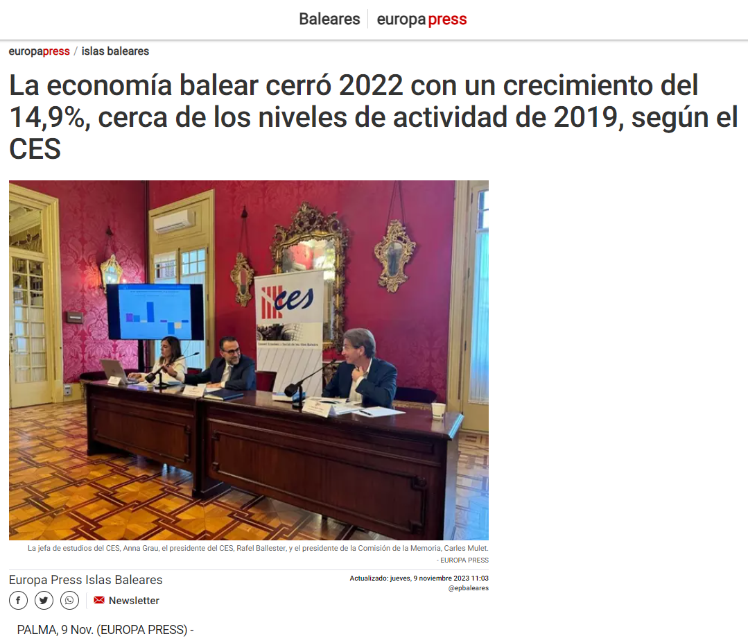 L'article destaca algunes de les dades més rellevants compartides en una roda de premsa al Parlament de les Illes Balears on s'ha fet la presentació de la Memòria del CES sobre l'economia, el treball i la societat de les Illes Balears 2022