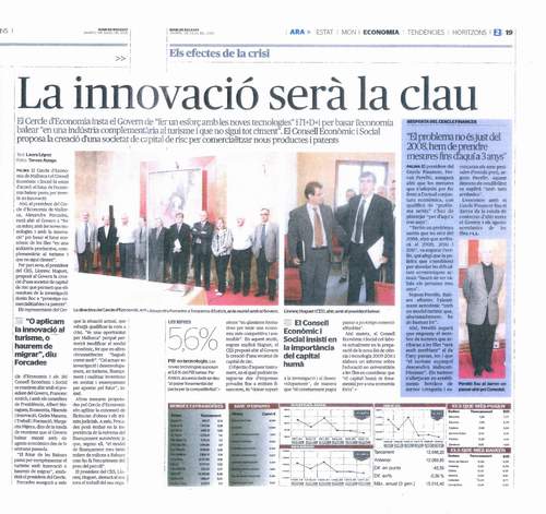 El Cercle d'Economia insta al Govern de "fer un esforç amb les noves tecnologies" i l'I+D+i per basar l'economia balear "en una indústria complementària al turisme i que no sigui tot ciment". El Conselle Econòmic i Social proposa la creació d'una societat de capital de risc per comercialitzar nous productes i patents