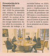 L'11 de novembre el CES presenta la Memòria del CES sobre l'economia, el treball i la societat de les Illes Balears 2020 al Parlament, al Govern i al públic