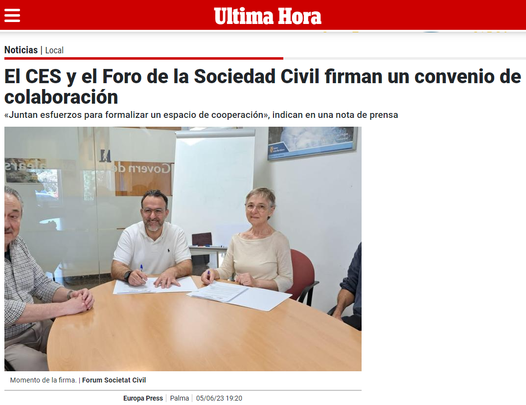 El artículo se hace eco del convenio de colaboración firmado entre el CES y el Fórum de la Sociedad Civil.