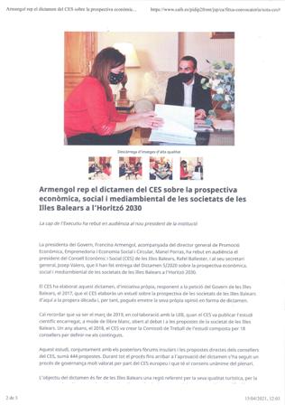 Armengol rep el dictamen del CES sobre la prospectiva econòmica, social i mediambiental de les societats de les Illes Balears a l’Horitzó 2030