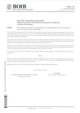 Decreto 19/2021, de 29 de marzo, de nombramiento del señor Rafel Ballester Salvà como presidente del Consejo Económico y Social de las Islas Baleares