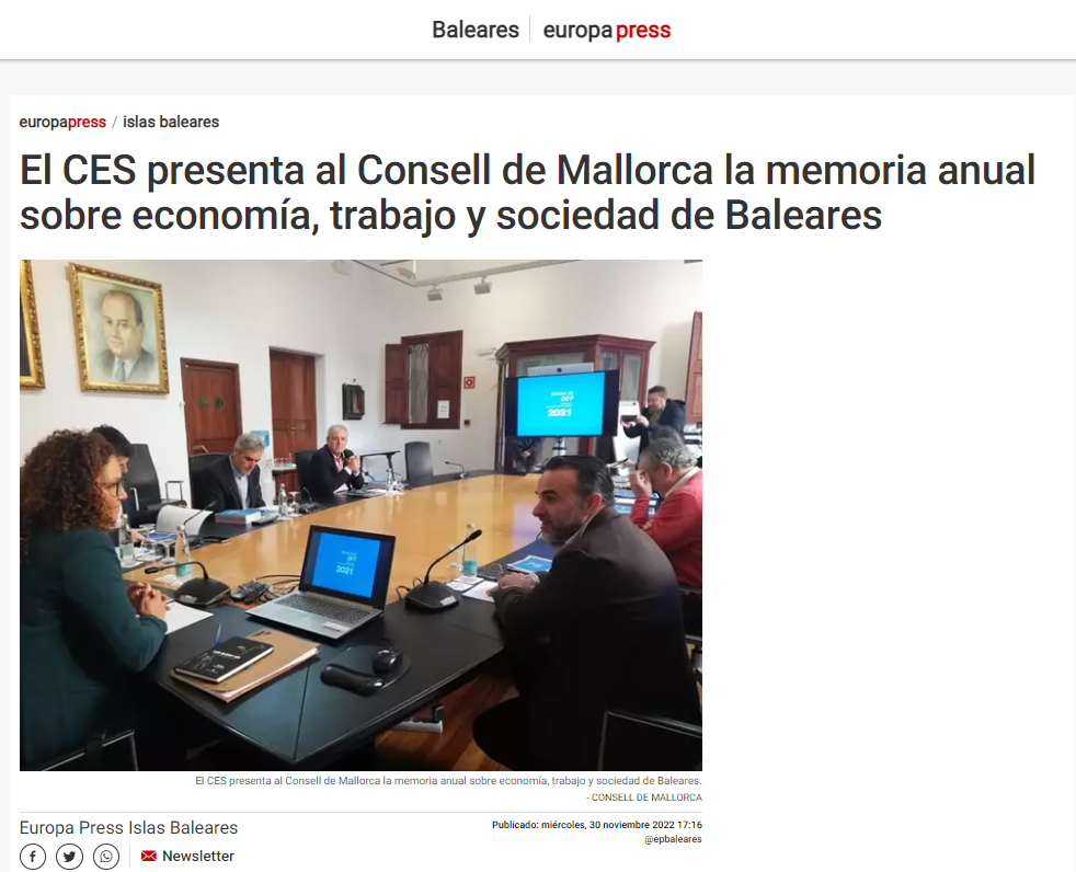 El Consell Econòmic i Social presenta la Memòria del CES sobre l'economia, el treball i la societat 2021 al Consell de Mallorca.