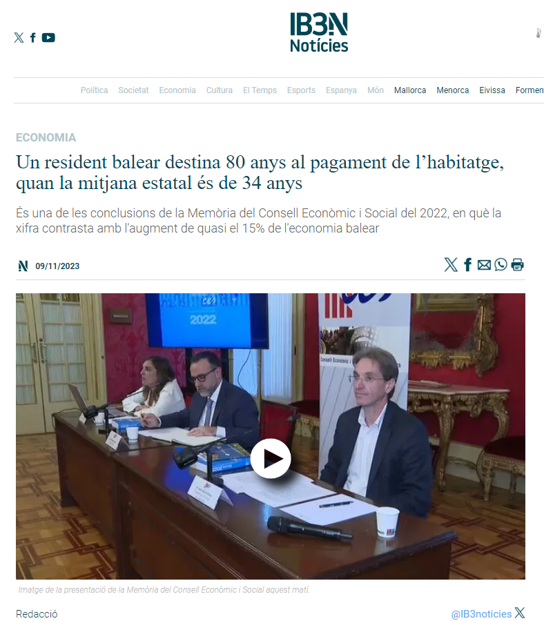 La noticia destaca algunos de los datos más relevantes compartidos en una rueda de prensa al Parlamento de las Islas Baleares, donde se ha hecho la presentación de la Memoria del CES sobre la economía, el trabajo y la sociedad de las Islas Baleares 2022