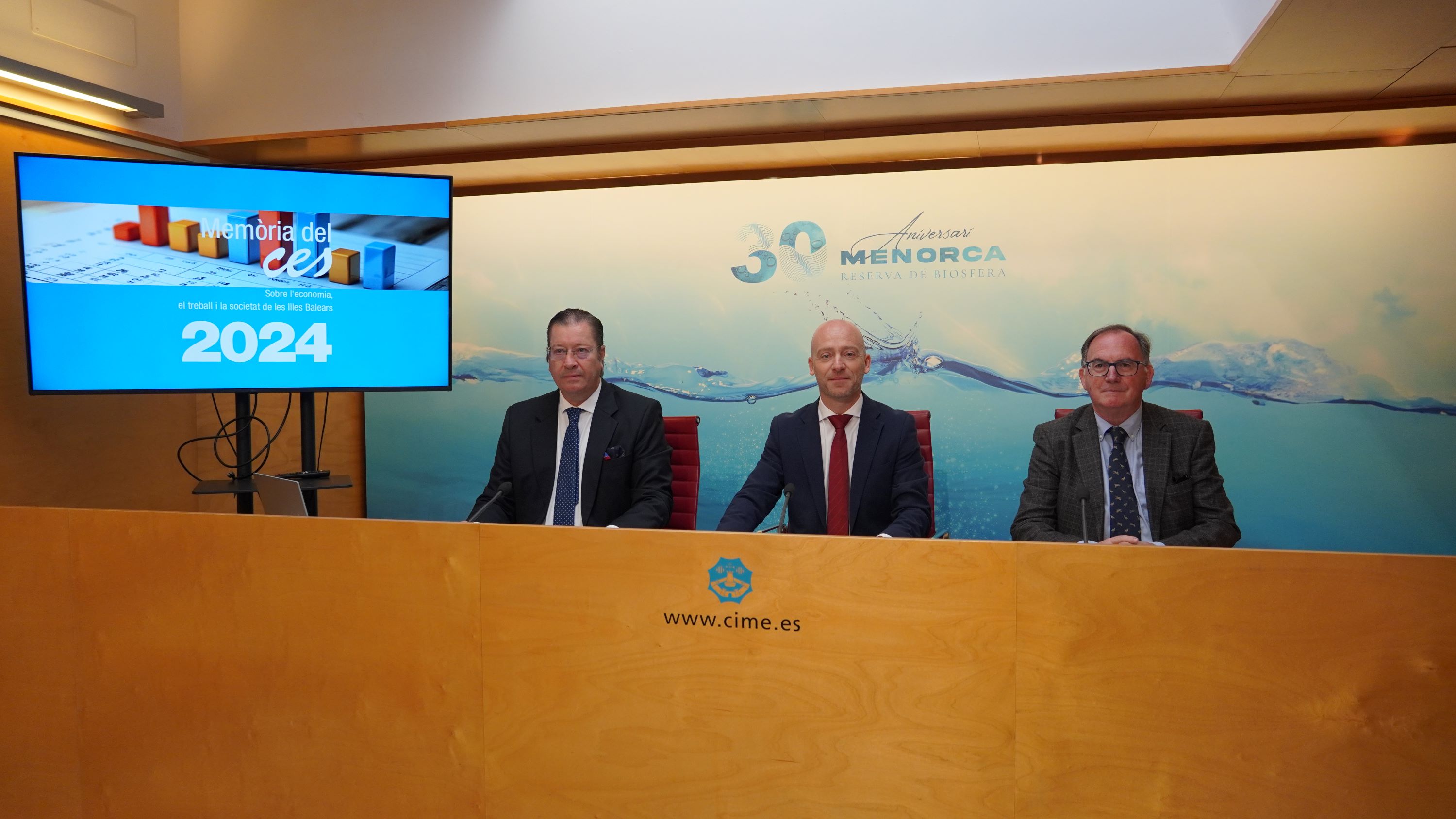 El presidente del Consejo Económico y Social de las Islas Baleares (CES), Francesc Fiol, ha expuesto esta mañana en rueda de prensa en el Consejo Insular de Menorca, los datos más relevantes de la Memoria del CES junto con el presidente del Consejo Insular de Menorca, Adolfo Vilafranca; y el secretario general del CES, Antonio Alcover.