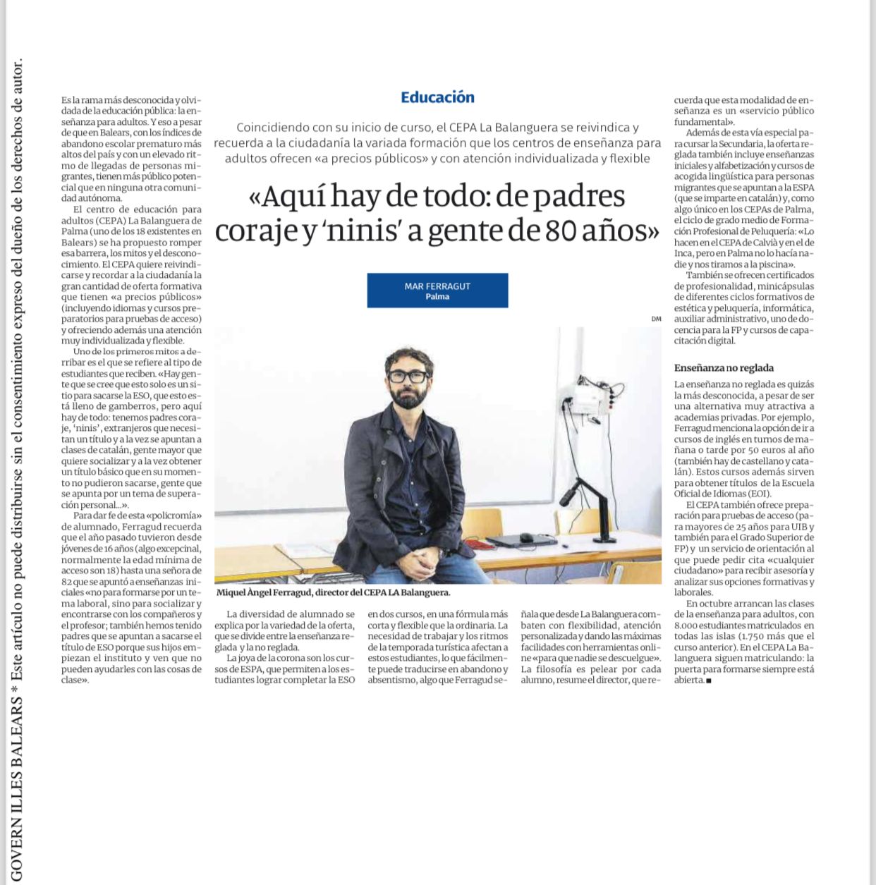 Recull de premsa 2025/06/04: El món a l’escola: històries de vida i integració (CEPA Pitiüses) 2025/05/25: Gimcana del CEPA Llevant 2024/10/02: Interviu al director del CEPA La Balanguera (Palma) 2024/09/27: Inici de curs 2024/09/16: El conseller vol reforçar les escoles d'adults |