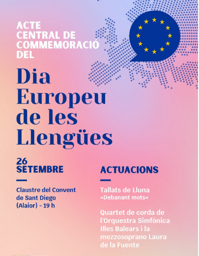 Este año, el acto central de conmemoración del Día Europeo de las Lenguas será un concierto que contará con dos propuestas musicales especiales: el espectáculo Debanant paraules, del grupo Tallats de Lluna, y el cuarteto de cuerda de la Orquesta Sinfónica de las Illes Balears (OSIB) con la mezzosoprano Laura de la Fuente.