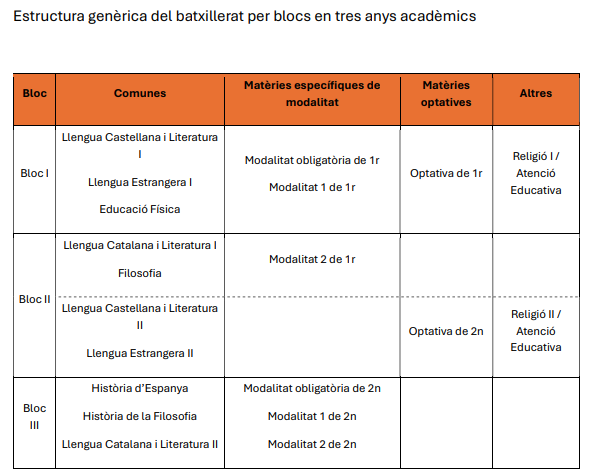 Estructura genèrica del batxillerat per blocs en tres anys acadèmics
