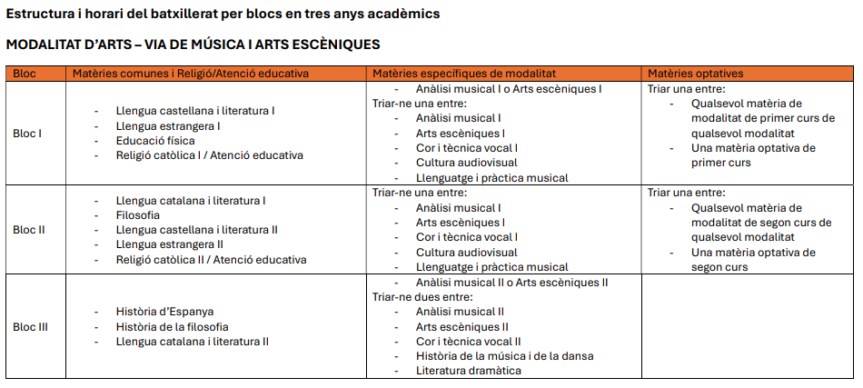 Estructura del batxillerat per blocs per modalitat i, si escau, via
