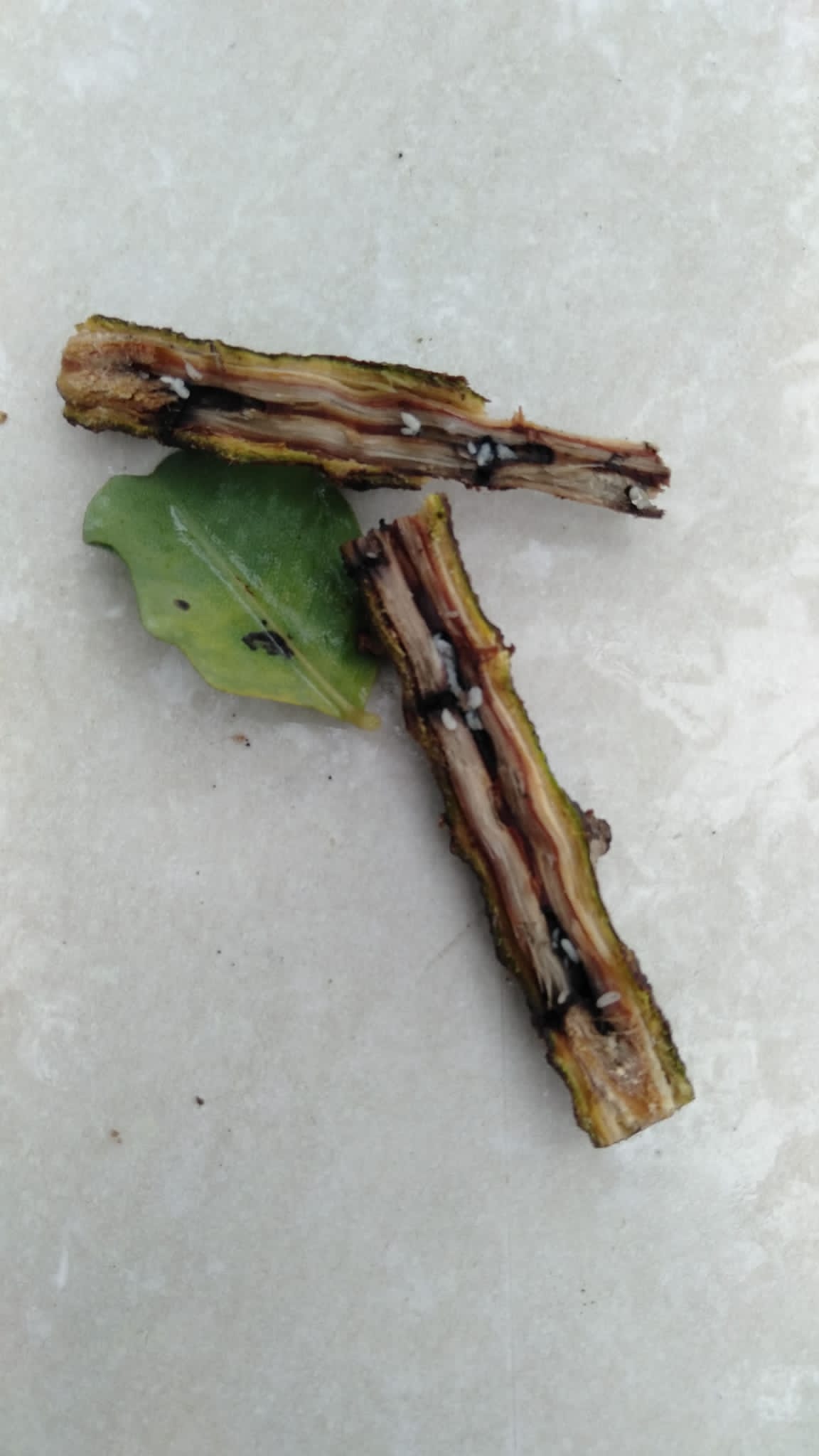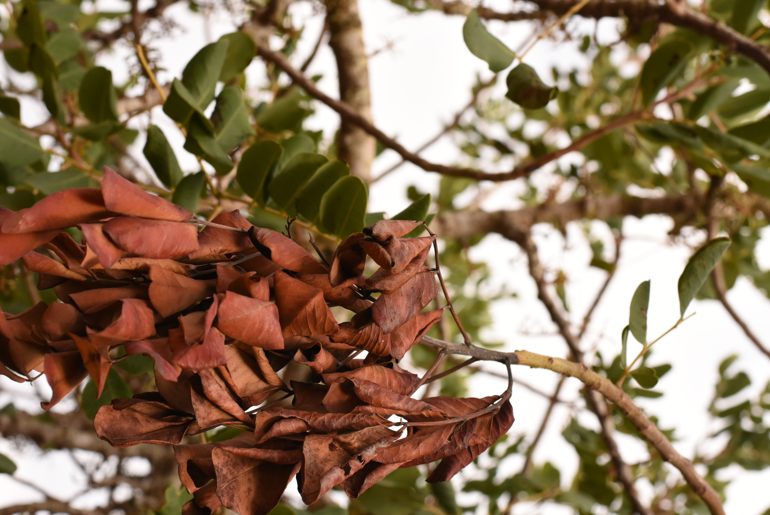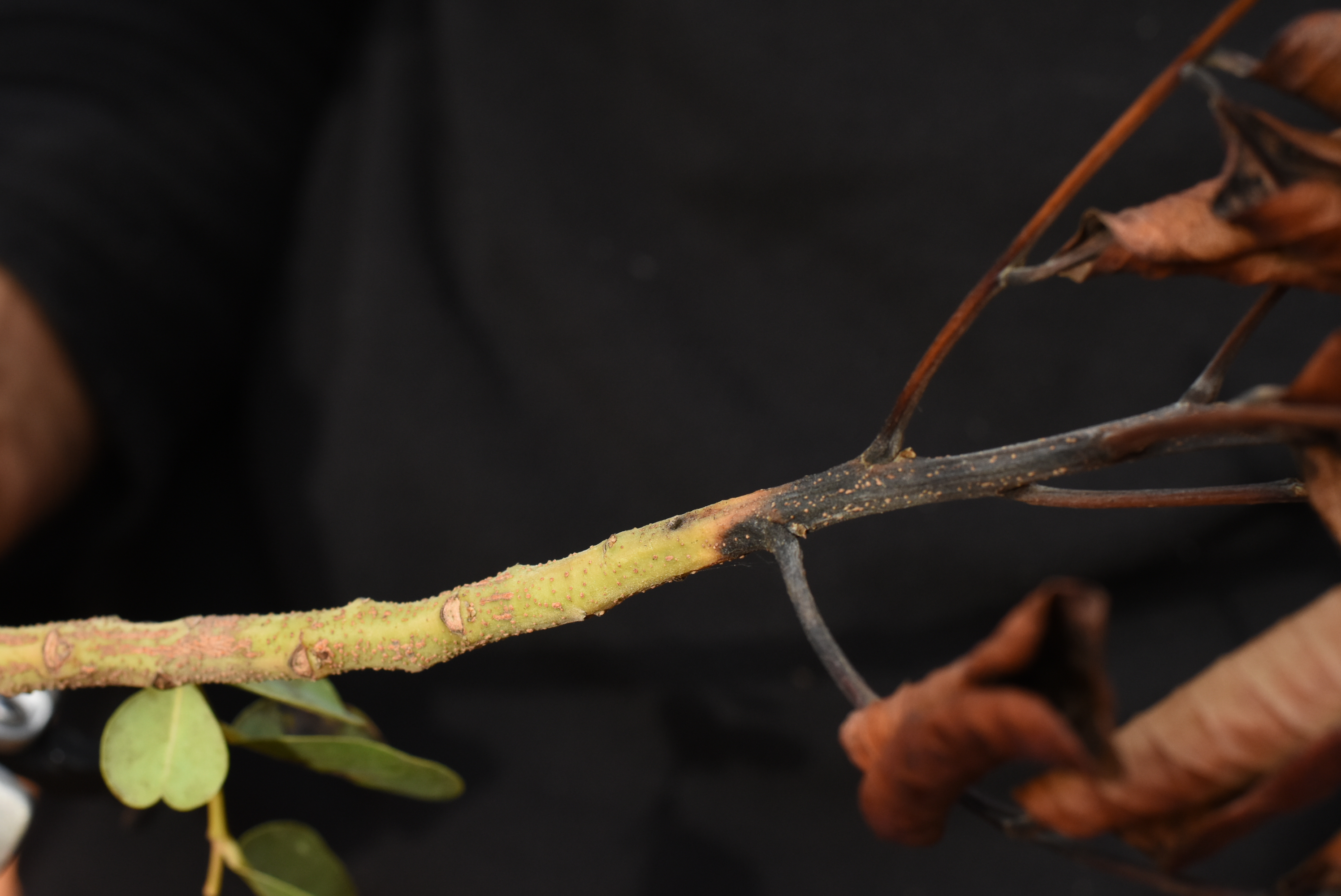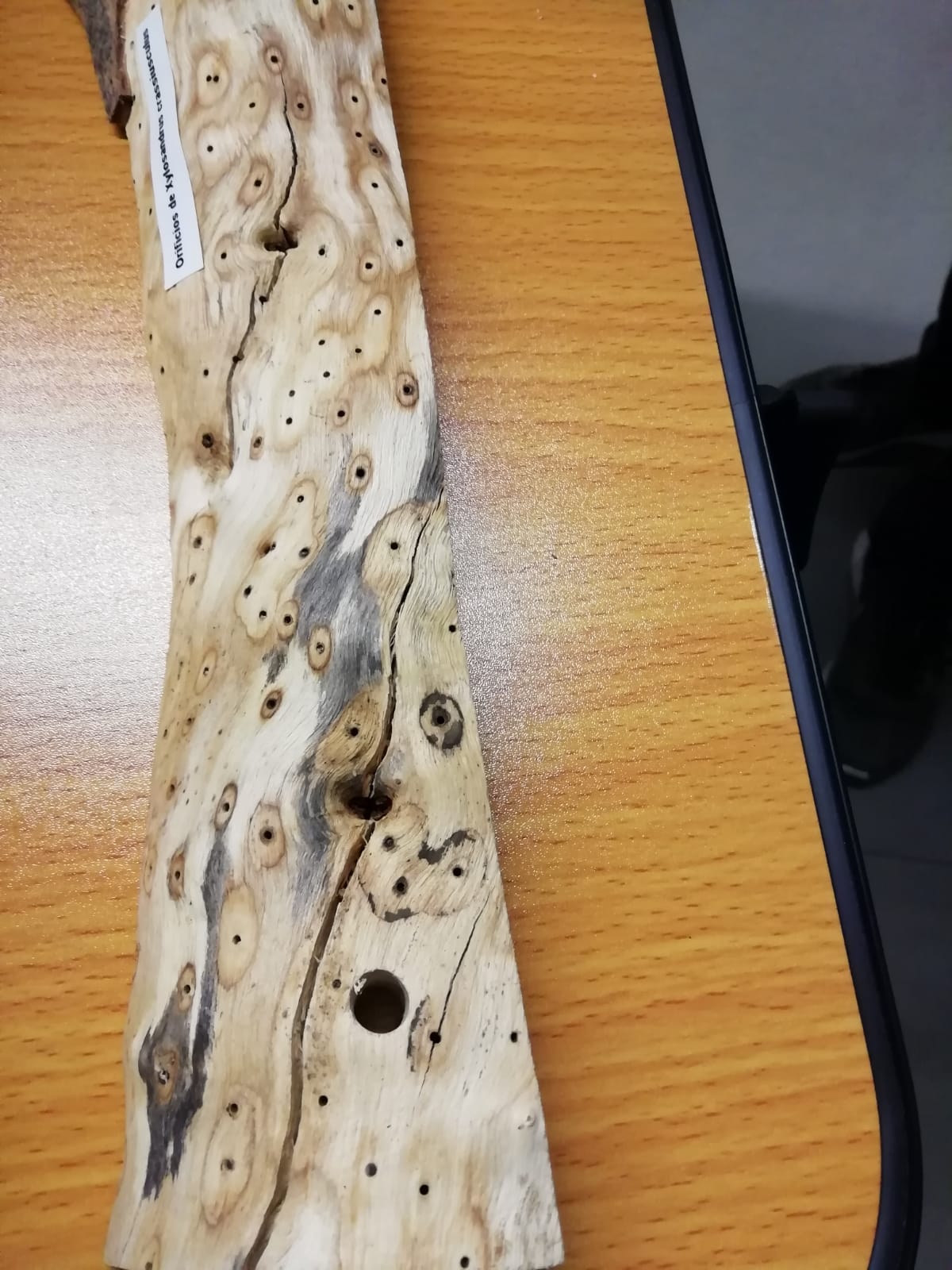 - Foradets d'entrada (0,8 mm diàmetre), en les branques, algunes amb exsudats més o menys gomosos.