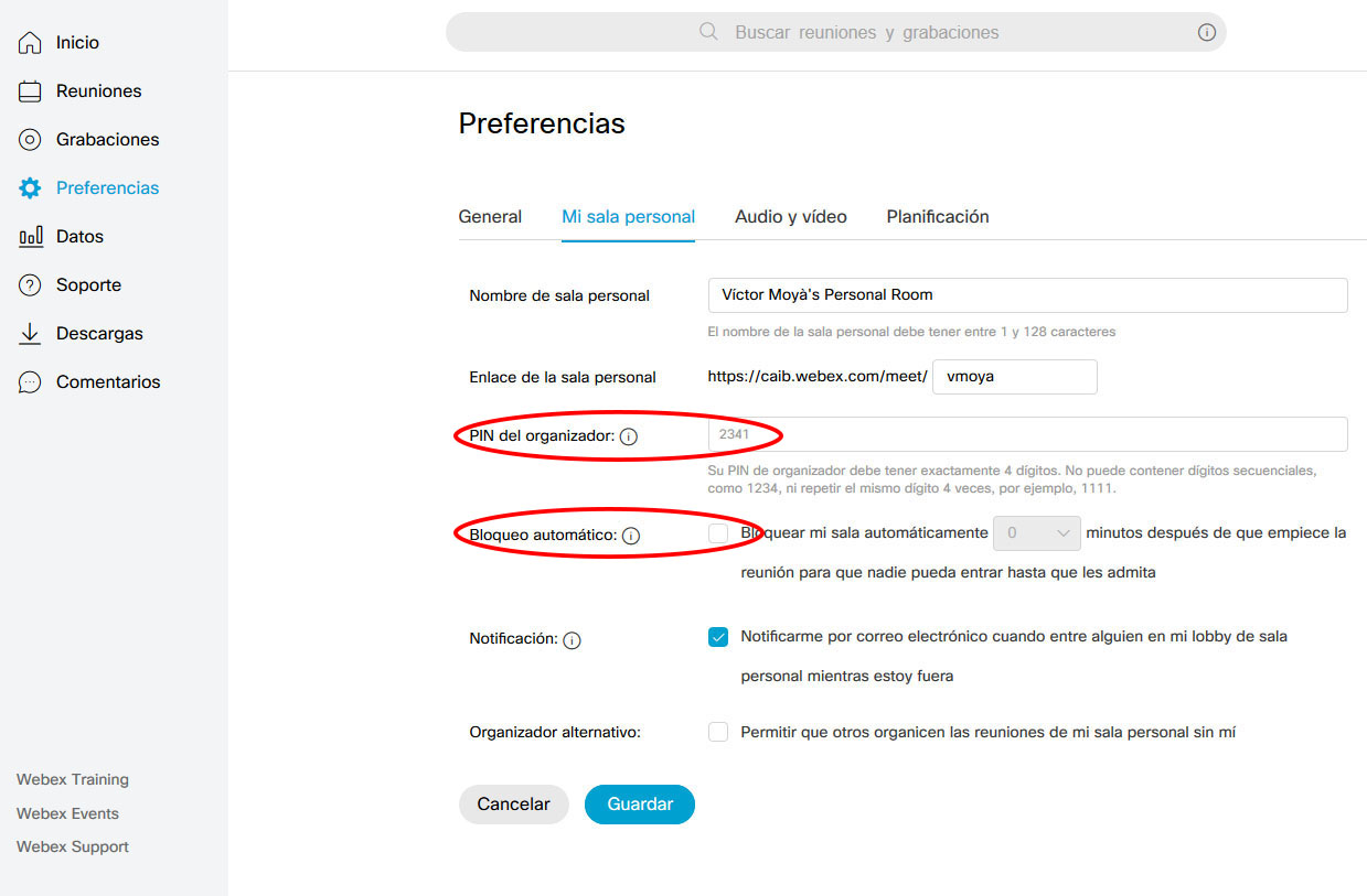- Una vez conectados, para entrar en la sesión como anfitrión, cuando se nos pregunte, tendremos que teclear el código PIN mencionado antes. Para una reunión programada, el código es de 6 cifras y lo encontramos en nuestra cuenta webex, pulsando sobre la referencia a la reunión programada (en el apartado de Reuniones). Por otro lado, en caso de sala personal, se trata de un código de 4 cifras (modificable) que podemos encontrar en Preferencias - Sala Personal. En las imágenes siguientes podemos ver los dos casos.