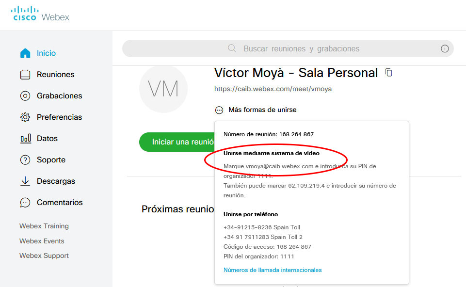 En el caso de una sala personal, dicha dirección puede verse pulsando sobre la entrada "Más formas de unirse", situada en la página principal de la web personal webex de cada usuario. Se desplegará una ventana donde se muestran las diferentes formas de acceder en función del dispositivo usado. El formato es nombre_usuario@caib.webex.com