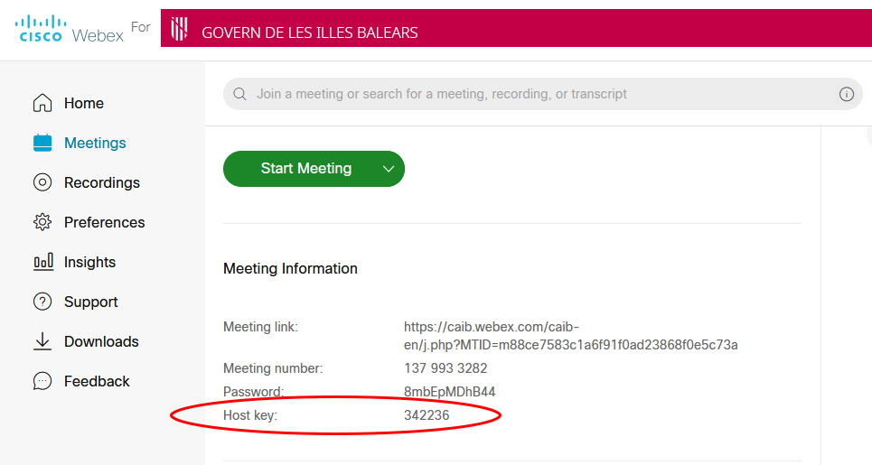 Si se trata de una reunión programada, en el correo que se envia a los invitados igualmente se informa de las distintas formas que hay para entrar en la reunión según el equipo usado. El formato, en este caso, sería identificador_reunión@caib.webex.com
