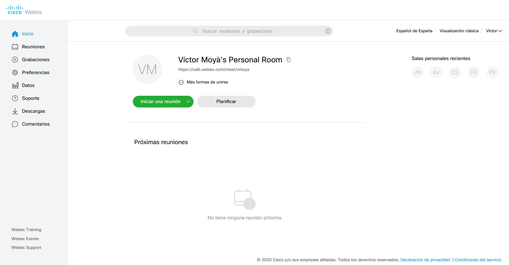 Vemos un menú de opciones en el lado izquierdo, el cuerpo principal referido a nuestra sala personal, con las reuniones planificadas, y una serie de opciones de configuración de la cuenta en la esquina superior derecha (idioma, vista, perfil, etc.). A la derecha también tenemos accesos directos a las últimas salas personales a las cuales nos hemos conectado.