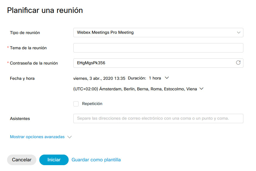 La contraseña no es necesario modificarla. A continuación, tenemos que indicar la fecha, hora y duración prevista de la reunión. El botón Repetición es útil si estas sesiones referidas a un mismo tema tienen que planificarse periódicamente.