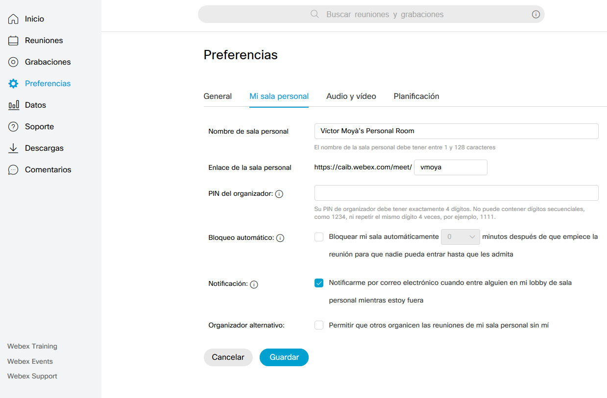 - Sala Personal: aquí podremos modificar el nombre de la sala, la URL, el PIN para entrar desde un equipo de sala, así como otras opciones interesantes que nos permiten bloquear el acceso a la sala pasado un cierto tiempo, y recibir un correo de aviso si alguien entra en nuestra sala sin nuestra presencia. También tenemos la posibilidad de ceder a otra persona la organización de reuniones en nuestra sala (tiene que estar dada de alta como usuaria del sistema).