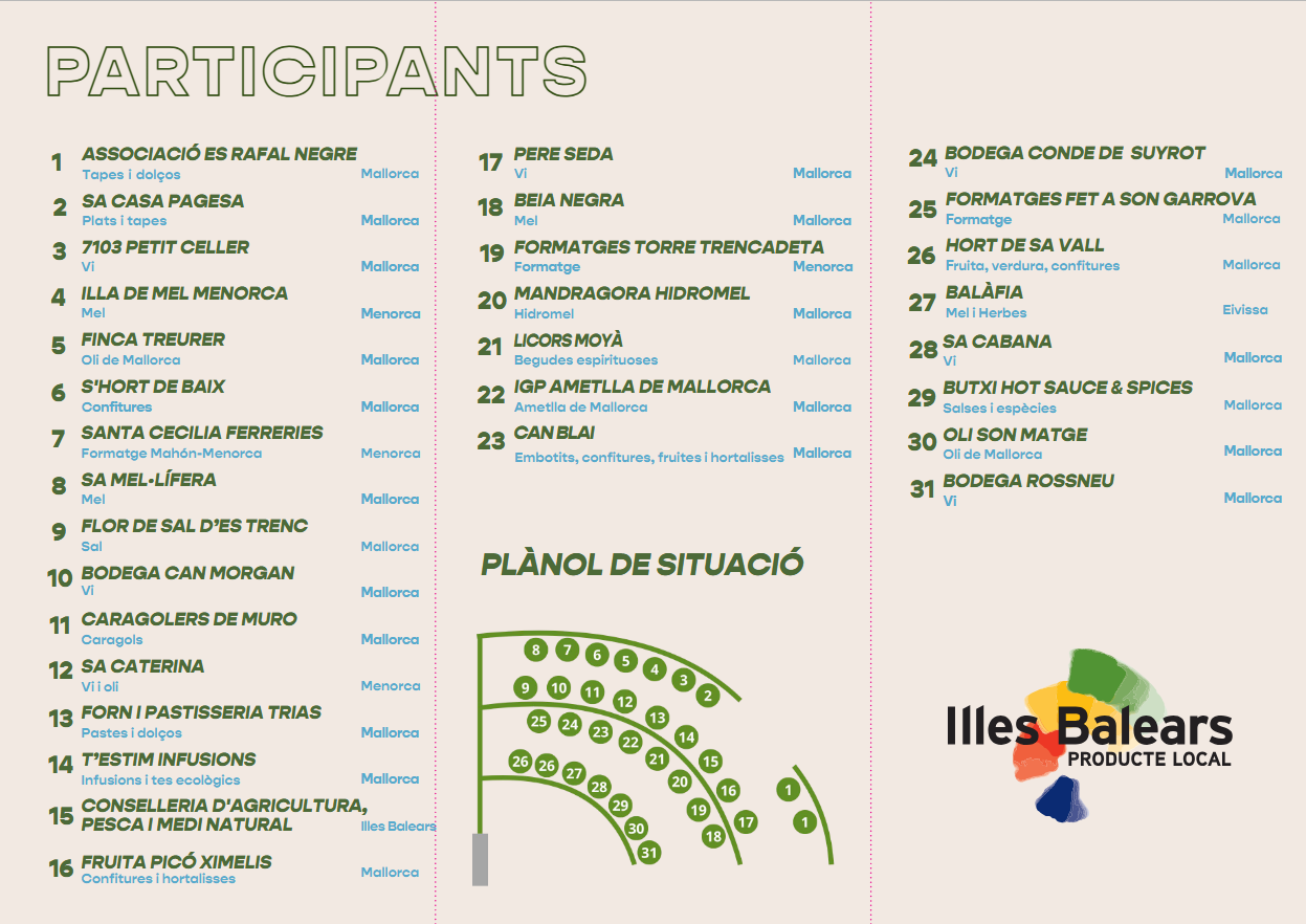 Entre els participants hi haurà cellers i productors de vi com Pere Seda, Bodegas Rossneu, Sa Cabana, Sa Catarina, 7103 Petit Celler, Bodega Can Morgan i Bodega Conde de Suyrot; productors d’oli com ara Finca Treurer, Oli Son Matge i Sa Caterina; formatgeries com Formatges Fet a Son Garrova, Formatges Torre Trencadeta i Santa Cecília Ferreries (Formatge Maó-Menorca), i productors de mel com Sa Mel·lífera, Beia Negra, Balàfia i Illa de Mel Menorca.