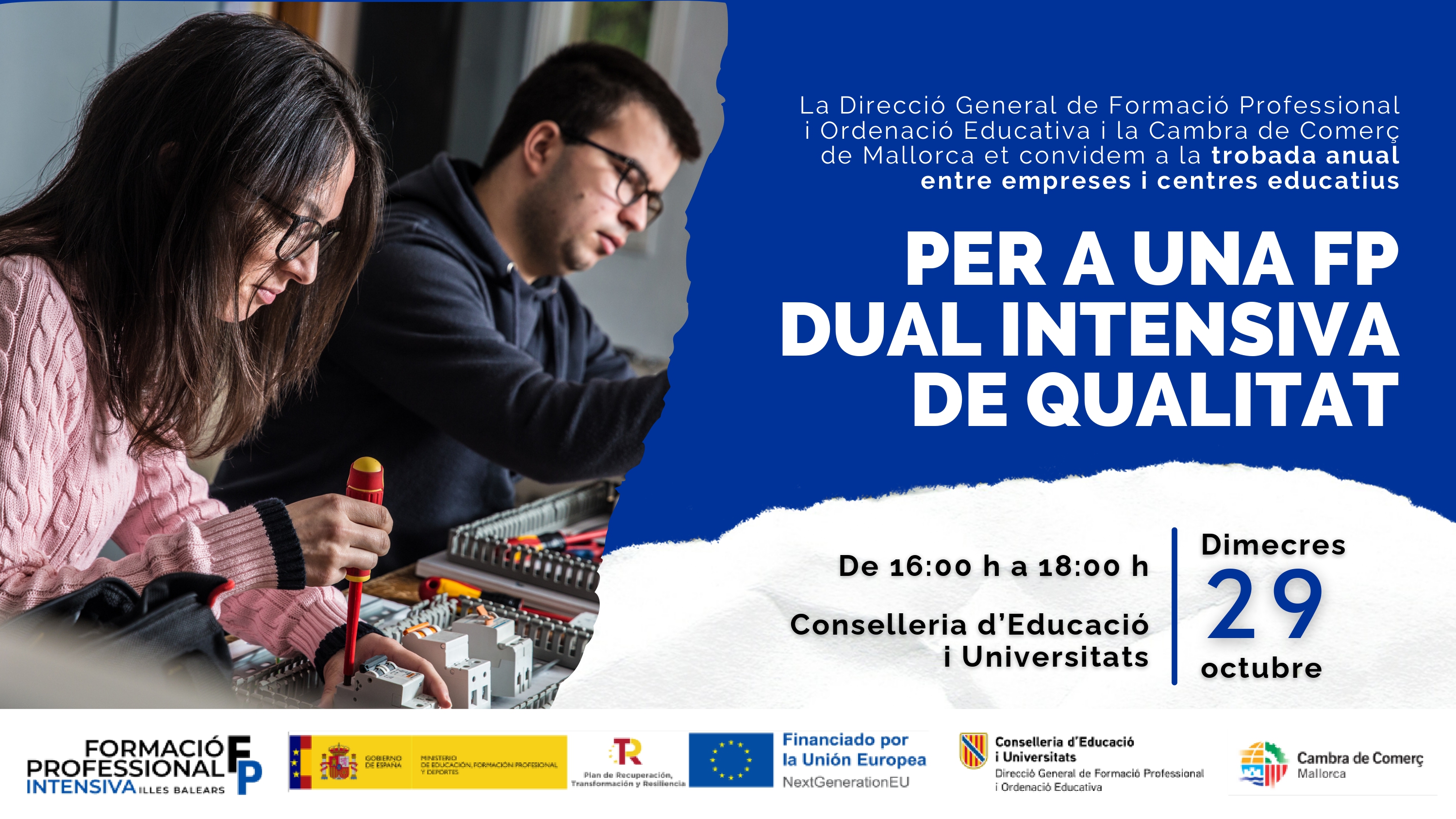 La Conselleria d’Educació i Universitats va acollir ahir dimecres, 29 d’octubre, la trobada anual entre empreses i centres educatius que participen en el programa d’FP dual intensiva amb contracte de formació, un model pioner impulsat fa dotze anys per la mateixa Conselleria i la Cambra de Comerç de Mallorca. Des de la seva creació, aquest projecte ha crescut i s’ha consolidat com un referent que ha permès a centenars d’alumnes formar-se de manera pràctica i a nombroses empreses incorporar talent qualificat.