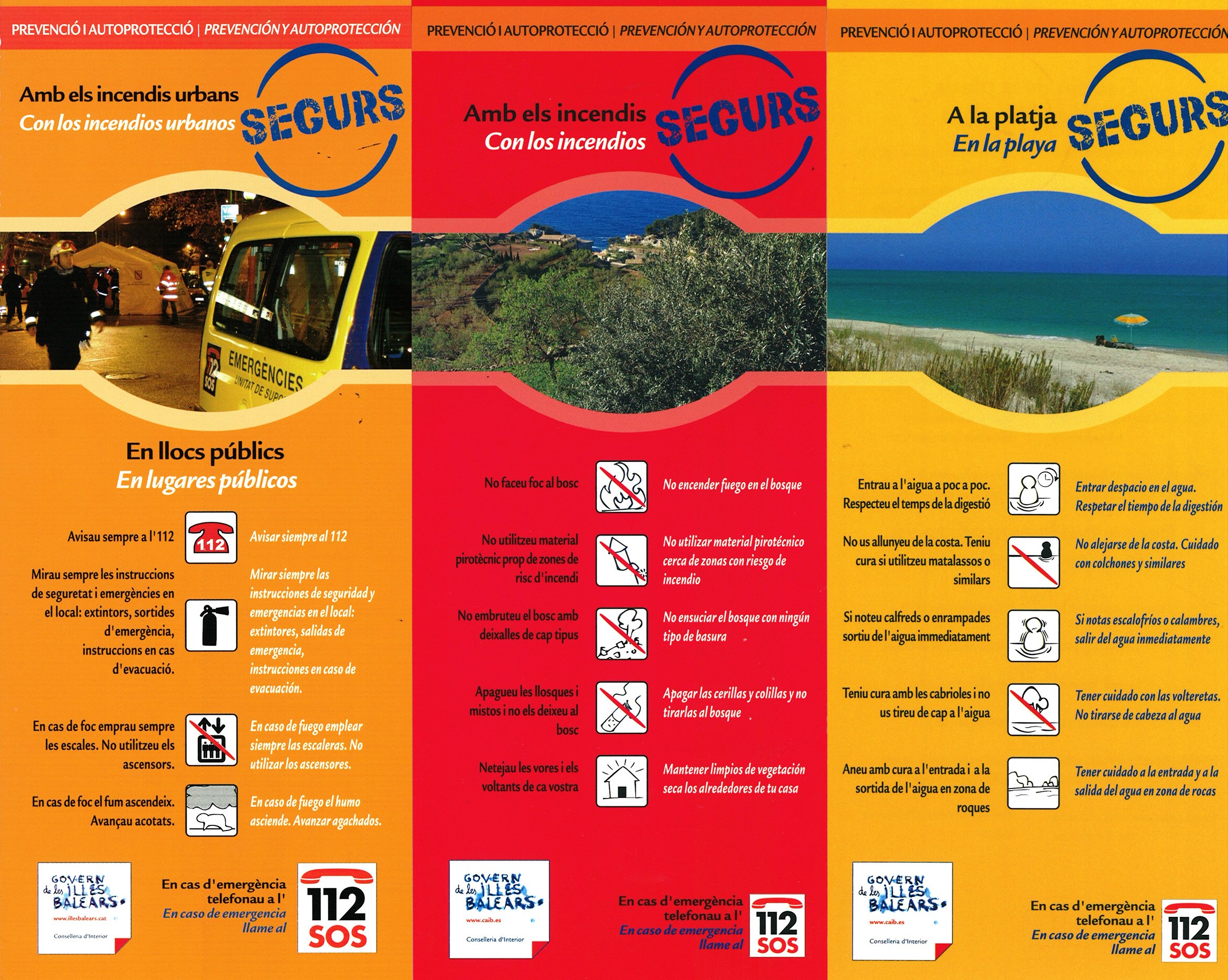 Con la campaña ILLES BALEARS SEGURES (Islas Baleares Seguras) el Gobierno de las Illes Balears nos recuerda que vivimos en una Comunidad segura. Pese a todo muy a menudo se producen accidentes que podrían evitarse por habernos relajado y no poner atención a sencillas pautas de prevención. La iniciativa fue ideada por los técnicos de la Dirección General de Emergencias (ahora Dirección General de Interior, Emergencias y Justicia) y difunde consejos de autoprotección sobre diversos riesgos: