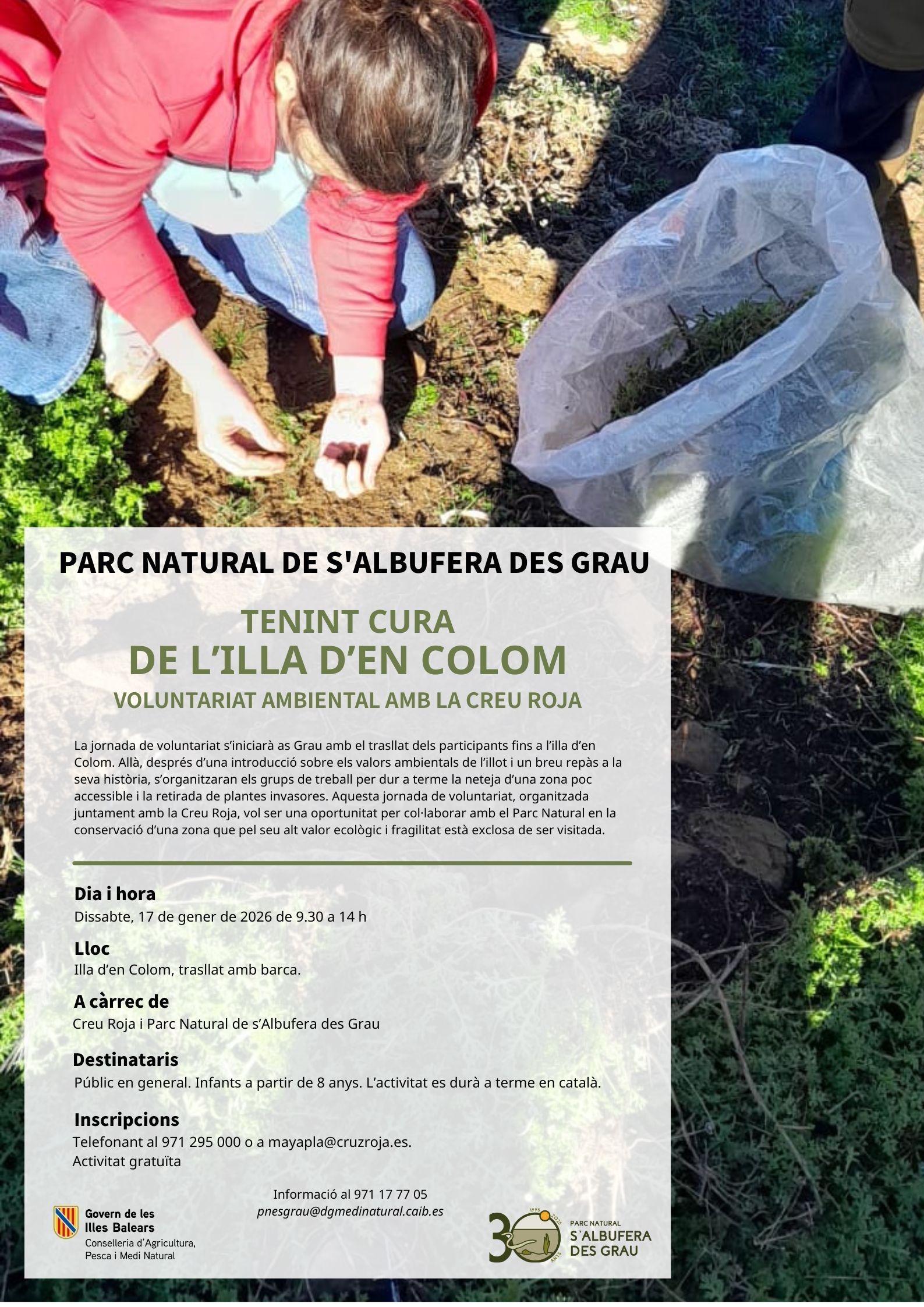 DESCRIPCIÓ: La jornada de voluntariat s’iniciarà as Grau amb el trasllat dels participants fins a l’illa d’enColom. Allà, després d’una introducció sobre els valors ambientals de l’illot i un breu repàs a laseva història, s’organitzaran els grups de treball per dur a terme la neteja d’una zona pocaccessible i la retirada de plantes invasores. Aquesta jornada de voluntariat, organitzadajuntament amb la Creu Roja, vol ser una oportunitat per col·laborar amb el Parc Natural en laconservació d’una zona que pel seu alt valor ecològic i fragilitat està exclosa de ser visitada.