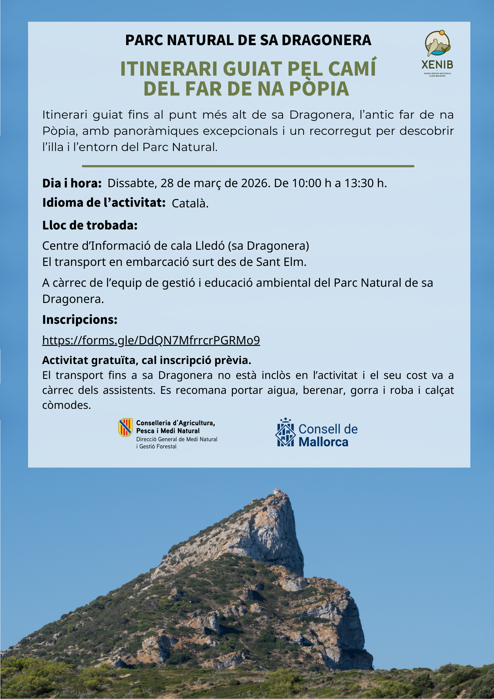 DESCRIPCIÓ: Itinerari guiat fins al punt més alt de l'illa, l'antic far de na Pòpia, amb panoràmiques espectaculars i un recorregut que ens permetrà descobrir l'interior de lilla i les peculiaritats del Parc natural.