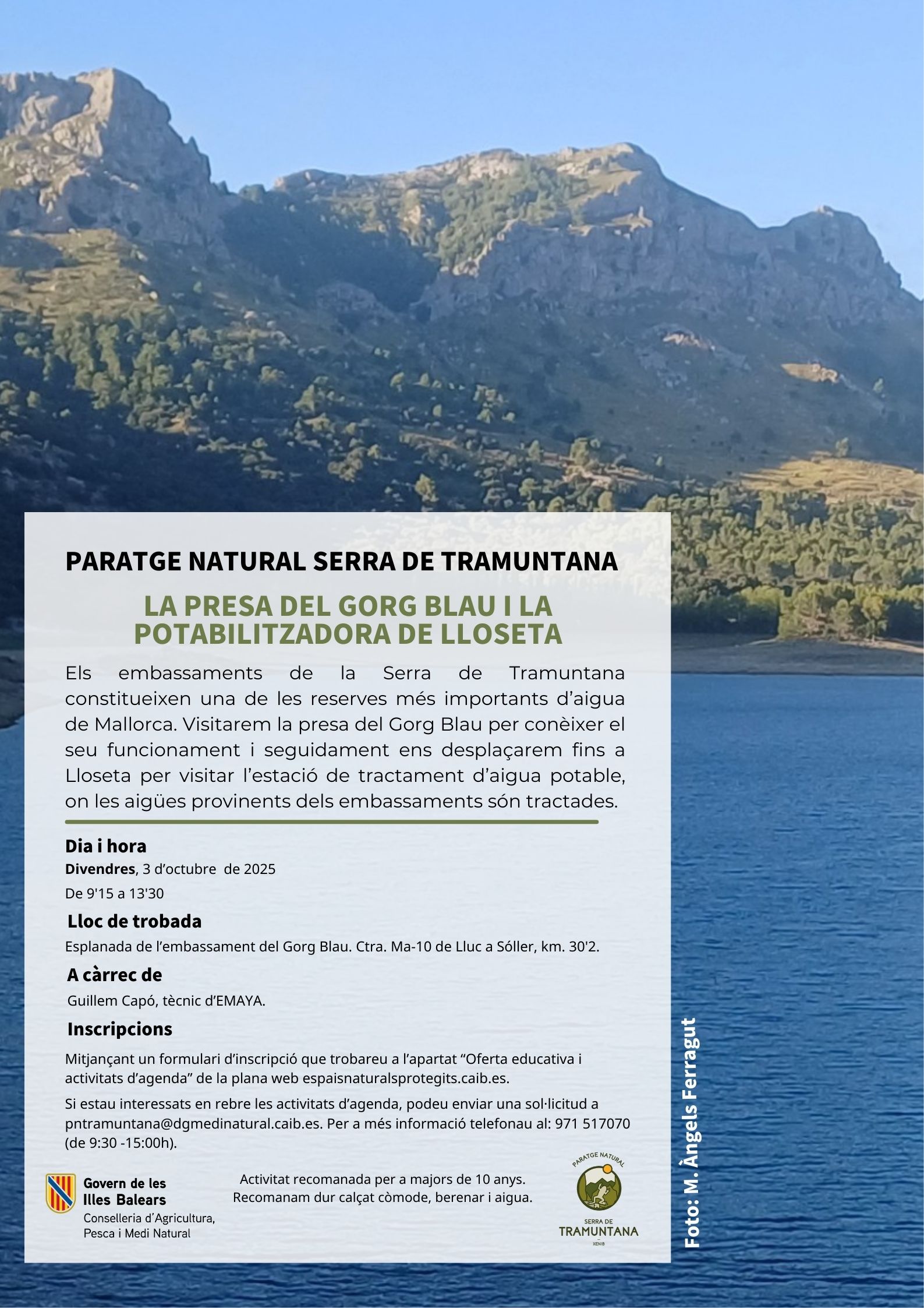 DESCRIPCIÓN: Los embalses de la Serra de Tramuntana constituyen una de las reservas más importantes de agua de Mallorca. Visitaremos la presa del Gorg Blau para conocer su funcionamiento y seguidamente nos desplazaremos hasta Lloseta para visitar la estación de tratamiento de agua potable, donde las aguas provenientes de los embalses son tratadas.