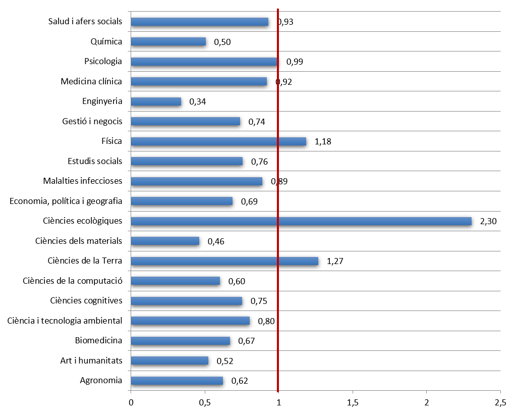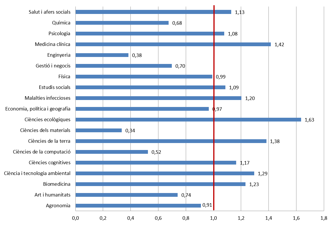 Índex d'activitat de la producció científica de les Illes Balears respecte a Espanya per àrees científiques (2010-2017)