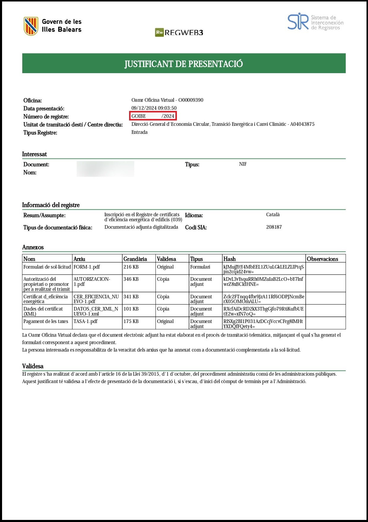 En aquest document, apareix en la part marcada a la imatge amb un requadre vermell, el número de GOIBE, que és el número de registre el cual té l'estructura GOIBEXXXXXX/YYYY, en el que XXXXXX representa el propi número de registre de la documentació e YYYY l'any en el que s'ha presentat la documentació. Aquest número de GOIBE es important per qualsevol consulta relacionada amb la comunicació d'auditoria energètica registrada.