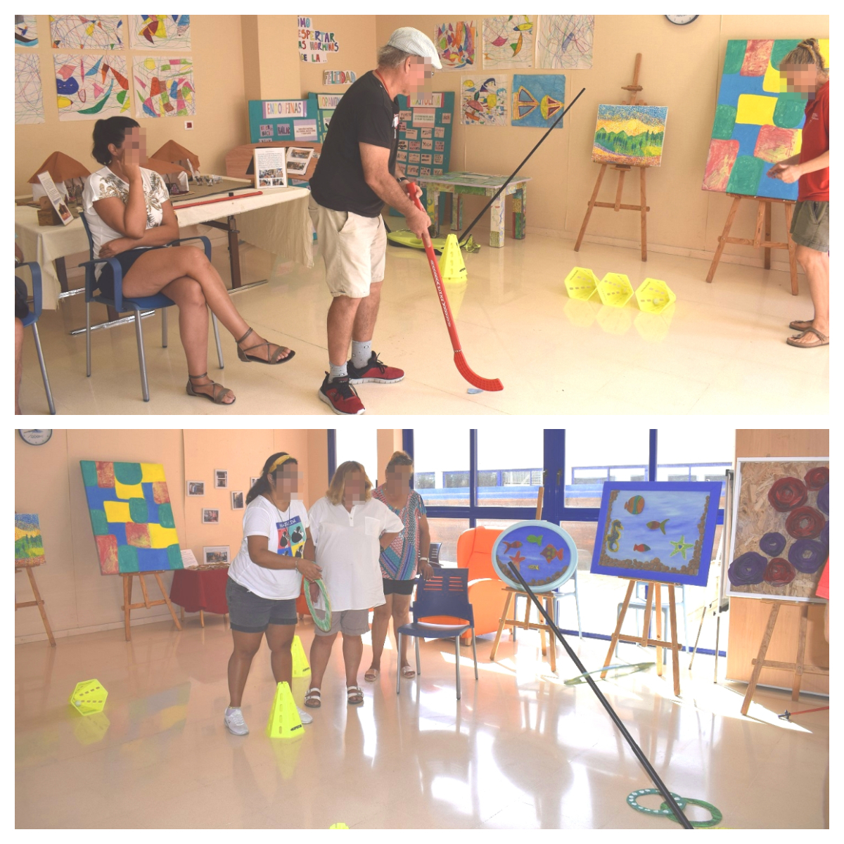 Entre els usuaris i les usuàries formen dos equips i van superant les proves esportives: zig-zag amb la pilota esquivant cons, bàsquet, prova de cèrcols i petanca.