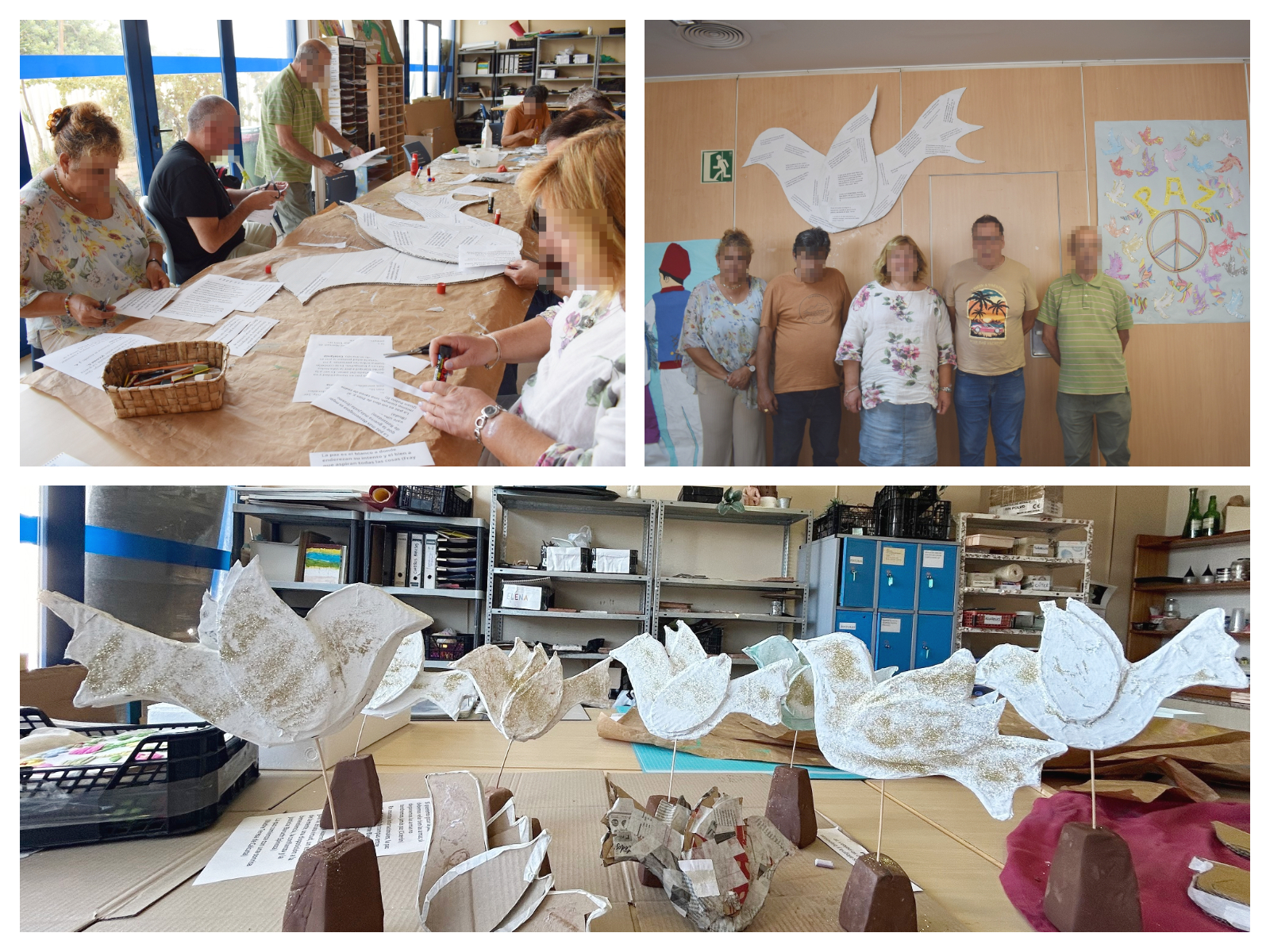 En el taller de escritura creativa se intenta practicar el arte de la palabra como forma de expresión de sentimientos y emociones y escriben sus opiniones sobre la paz que plasman sobre una gran paloma blanca realizada con cartón.