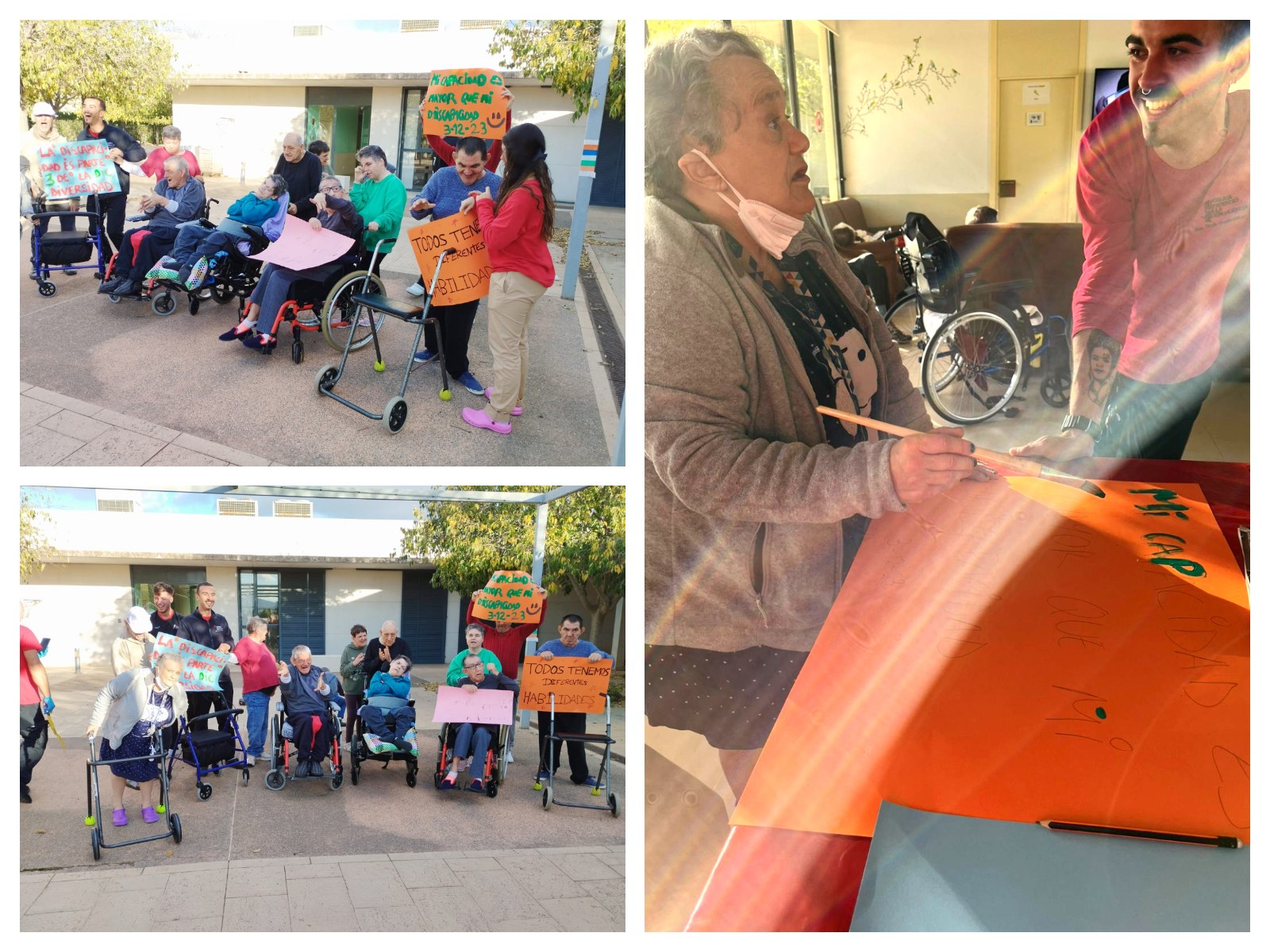 El domingo por la tarde salimos al patio del centro con los carteles que días antes habían confeccionado nuestros residentes con el apoyo del personal de atención directa, para reivindicar los derechos y la igualdad de oportunidades para todas las personas, independientemente de sus características.