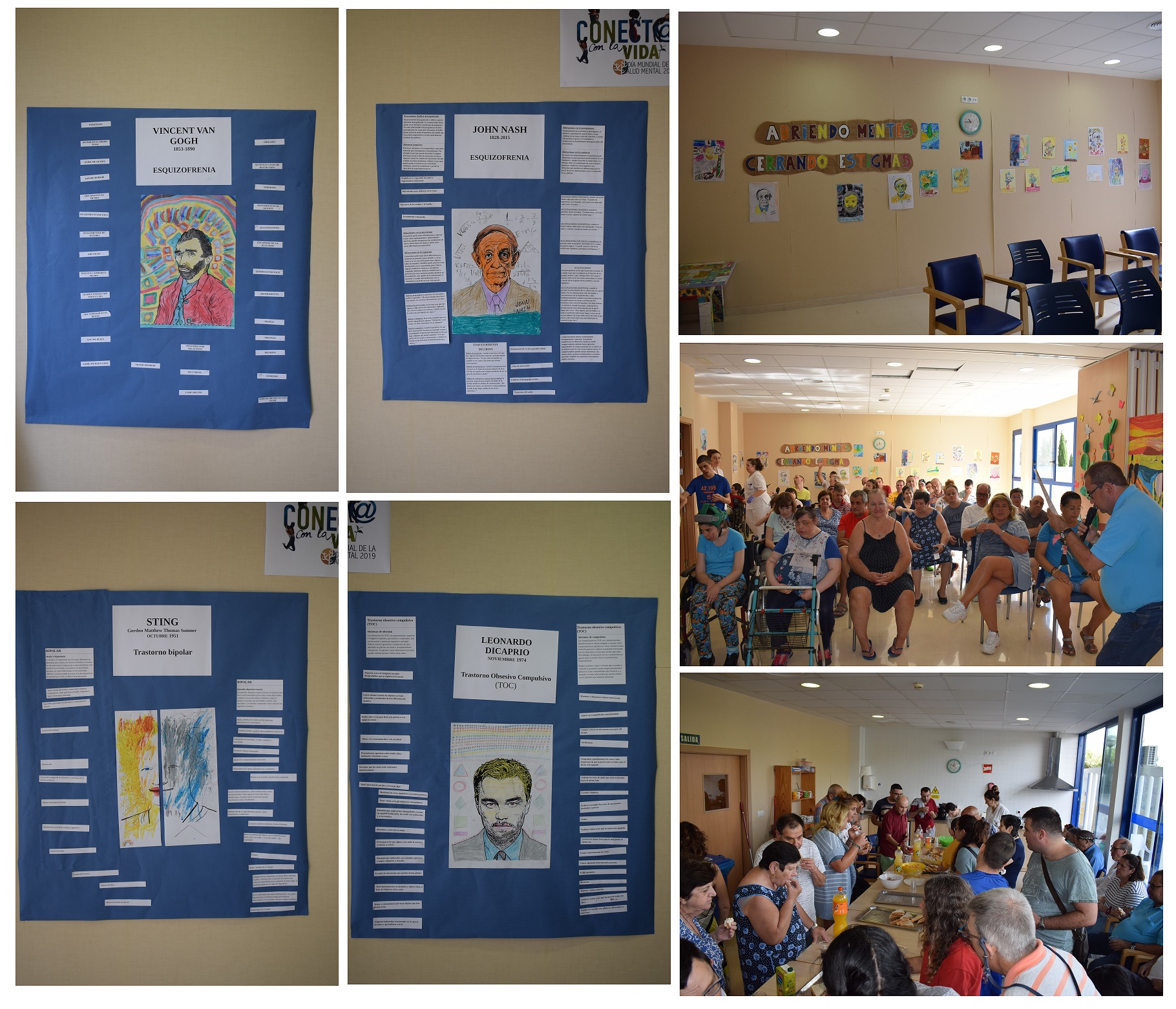 Durante el mes anterior preparamos en los diversos talleres cuadros, escritos y lecturas de personajes famosos con enfermedad mental para decorar el Centro de Día y tomar conciencia de que, aunque exista una enfermedad mental, la motivación nos hace luchar por lo que queremos hacer. Este año abrimos estas jornadas con un pregón a cargo de nuestra trabajadora social. Siguió la lectura de algunas de las vivencias de nuestros usuarios, como es su día a día y que supone para ellos tener una enfermedad mental y como la afrontan. Para finalizar este día de actos de concienciación hicimos un pequeño aperitivo para usuarios y profesionales y pusimos un poco de música y baile.