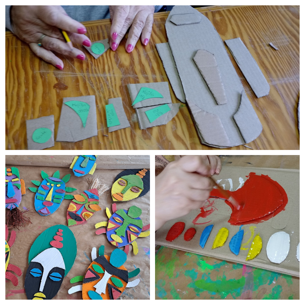 Tras ver videos sobre la historia de máscaras del mundo y en específico máscaras africanas, realizamos un trabajo que consiste en construir máscaras de cartón al estilo africano.